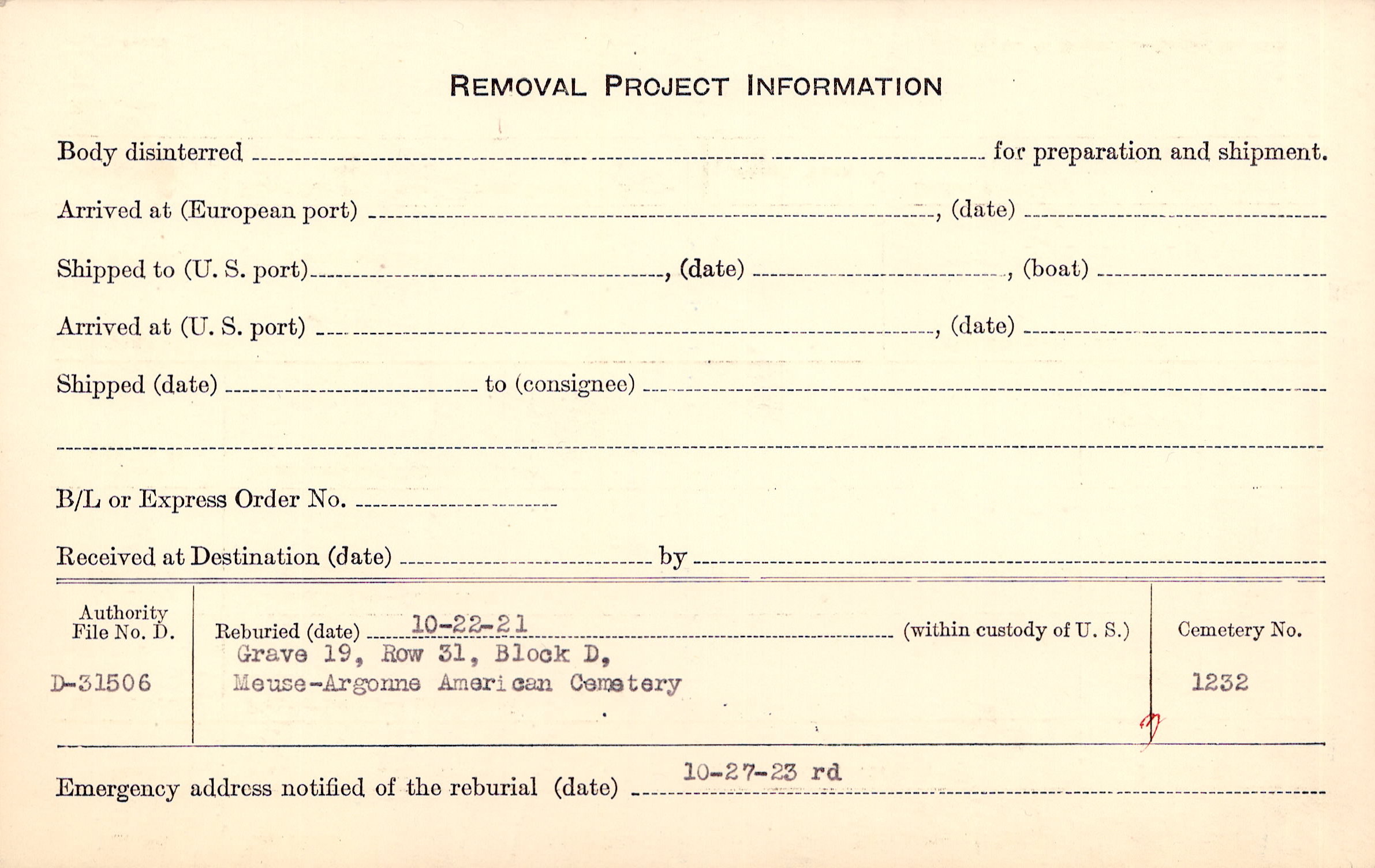 | Permanent Burial in Foreign Cemetery |