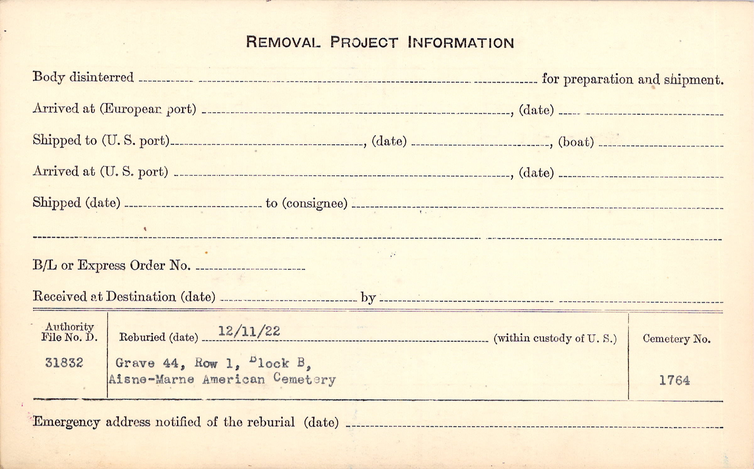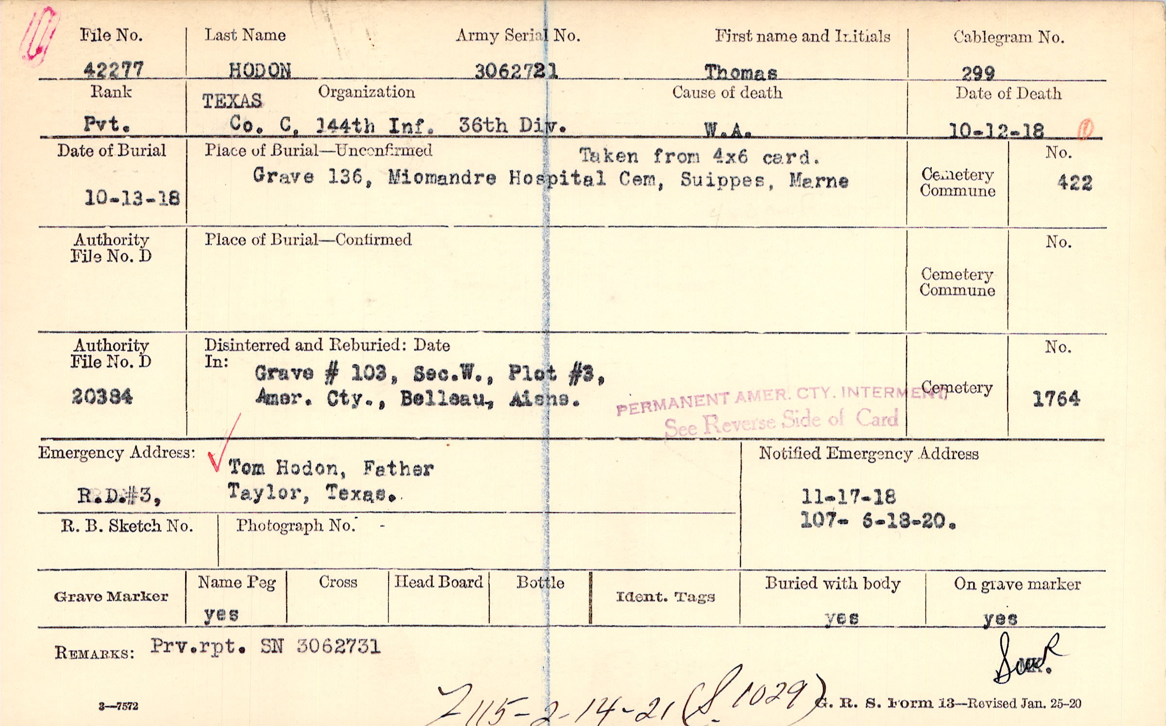 Grave 103, Section W, Plot 3, American Cemetery, Belleau, Aisne