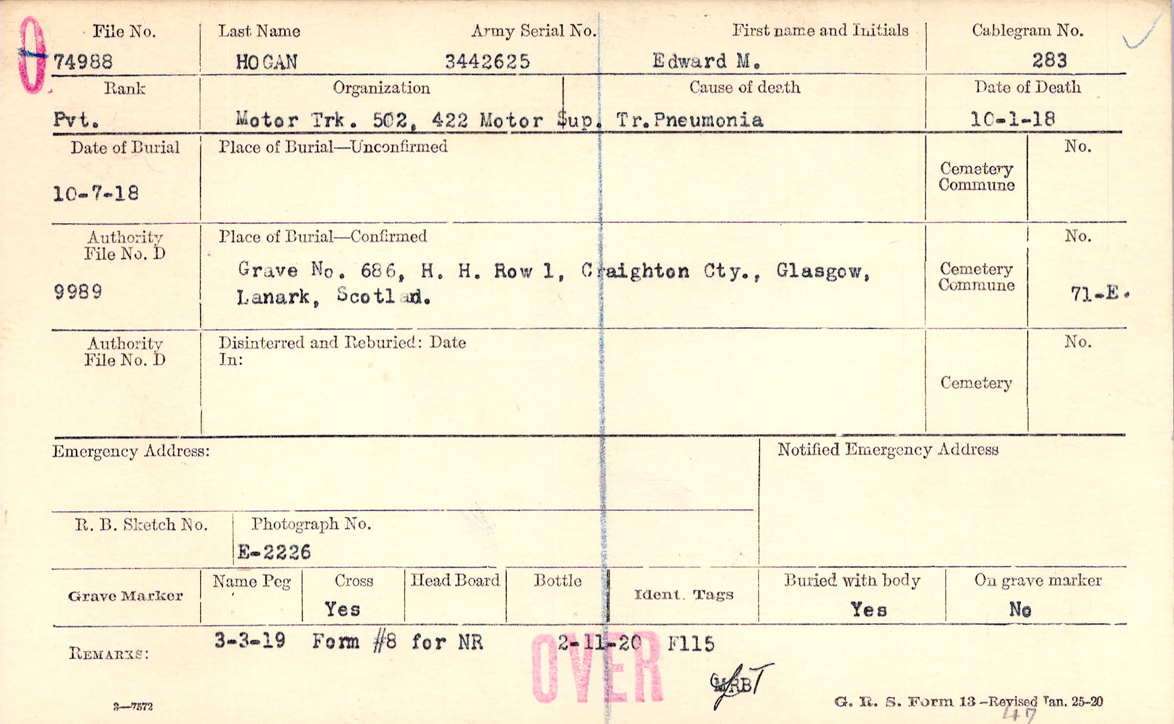Grave 686, H. H. Row 1, Craighton Cty. , Glasgow, Lanark, Scotland
