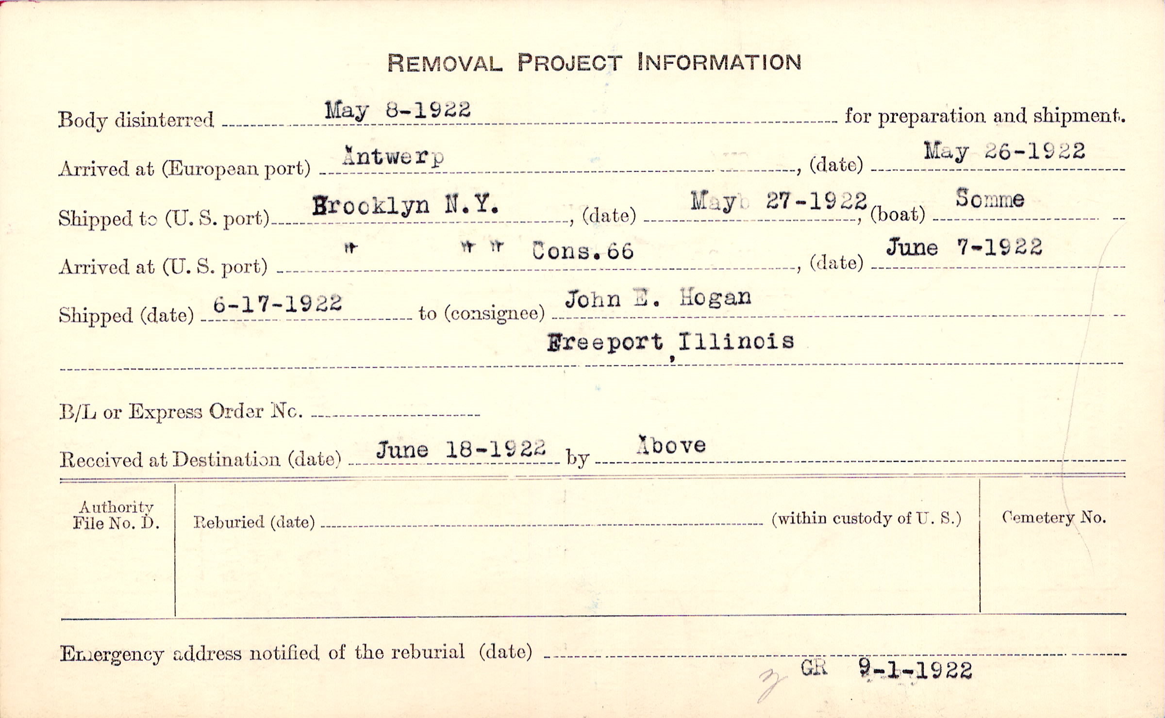 Body disinterred 5/8/1922 for preparation and shipment.