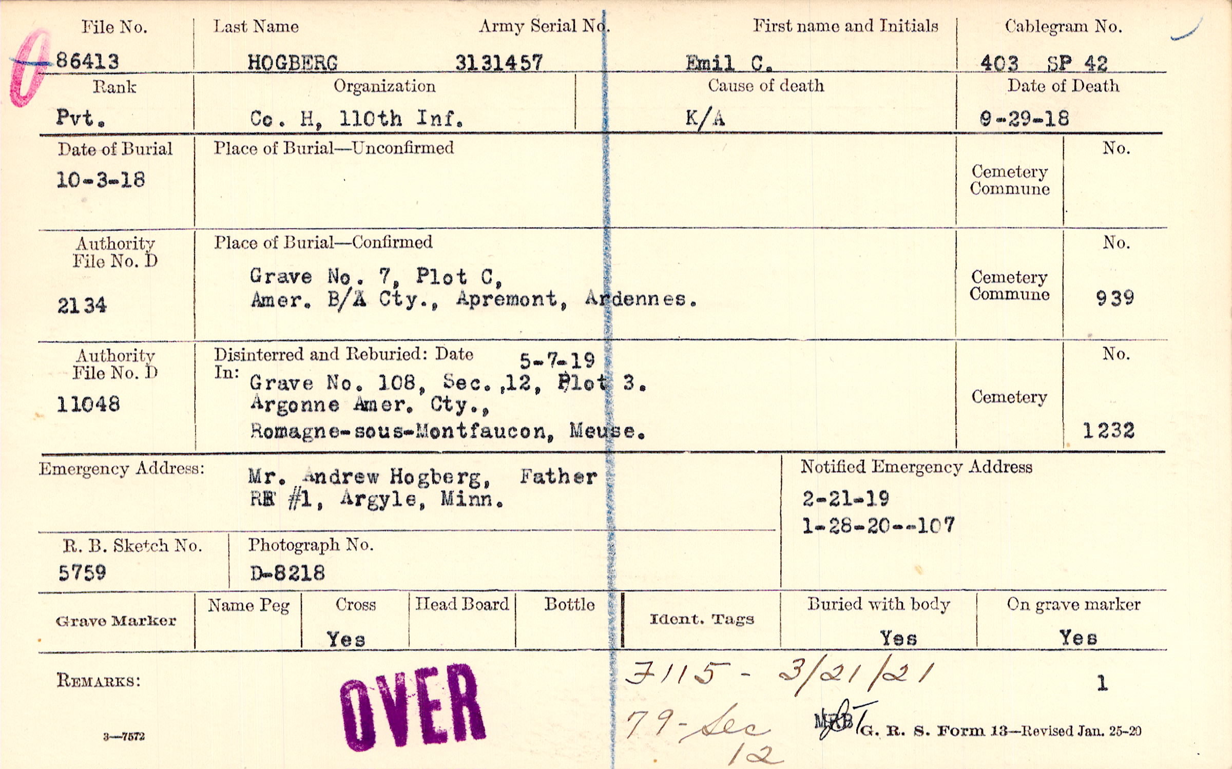 Grave 7, Plot C,Amer. B/A Cty, ,Apremont, Ardennes.