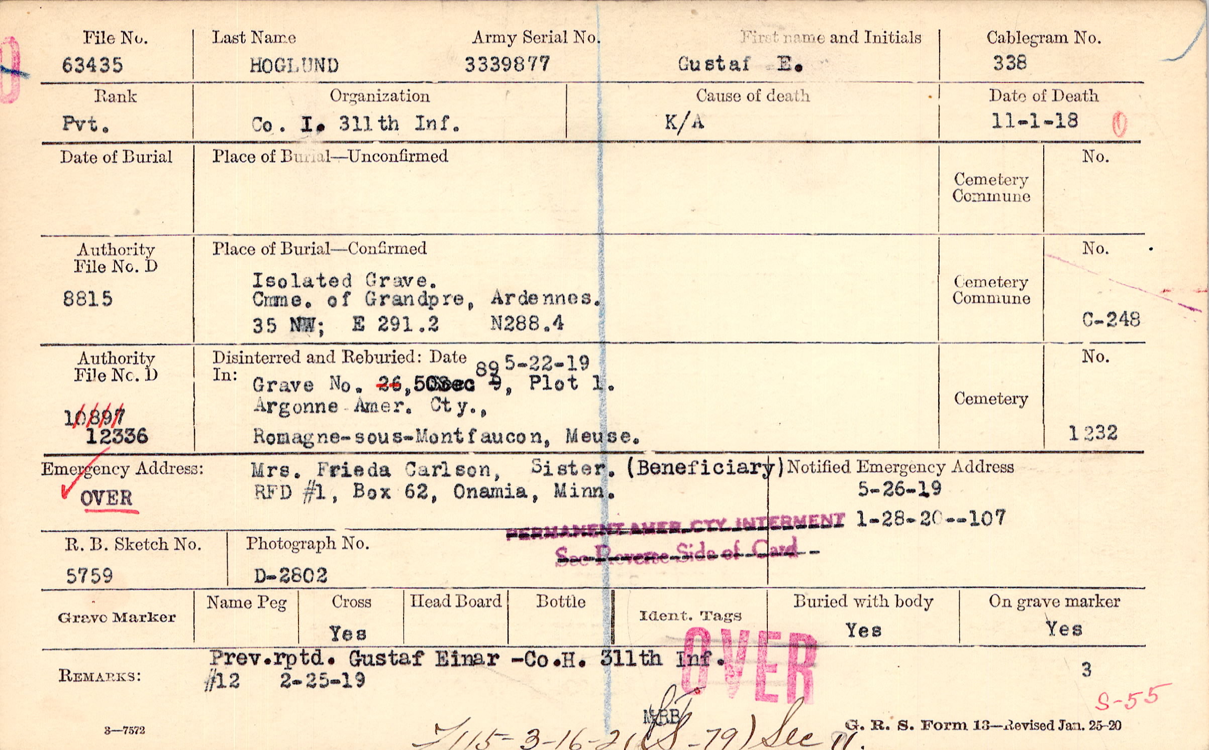 Mrs. Frieda Carlson, Sister. (Beneficiary), RFD #1, Box 62, Onamia, Minn., OVER
