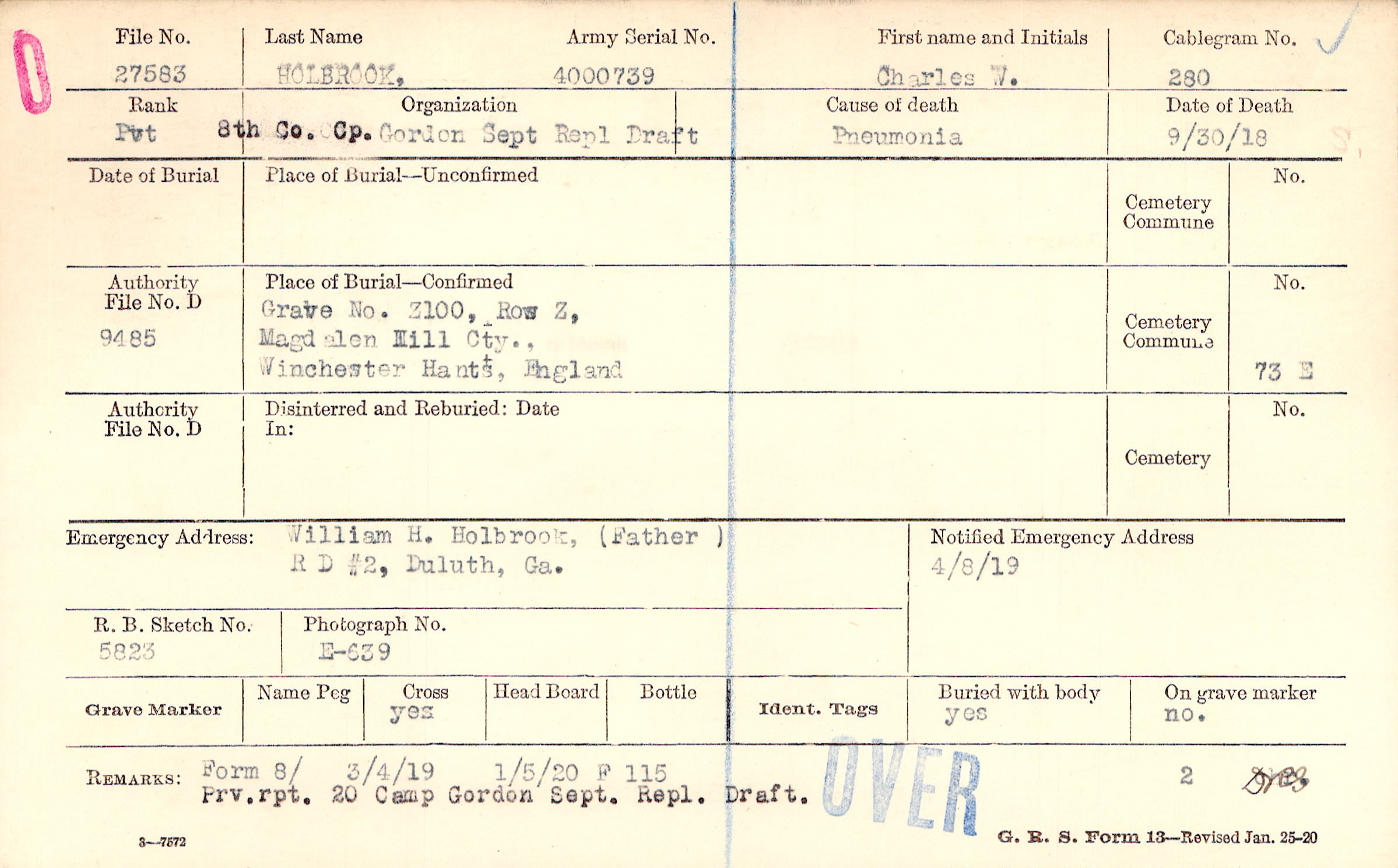 Grave Z100, Row Z, Magdalen Hill Cty., Winchester, Hants, England