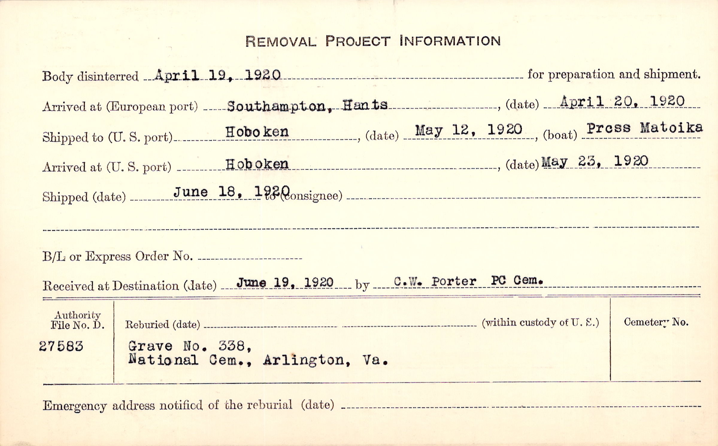 Body disinterred 4/19/1920 for preparation and shipment.