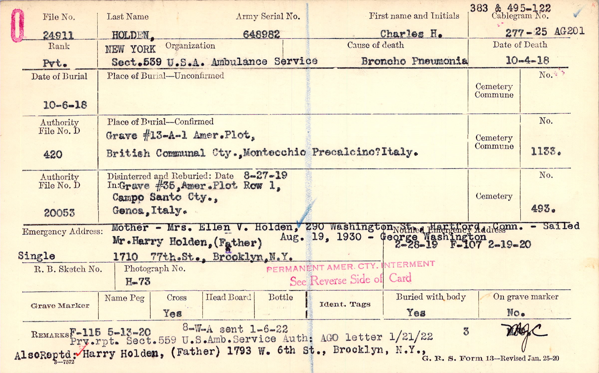 Prv. rpt. Sect. 559 U.S.Amb. Service Auth: AGO letter 1/21/22. Also reported: Harry Holden, (Father) 1793 W. 6th St., Brooklyn, N.Y.,, 8-W-A sent 1-6-22, F-115 5-13-20