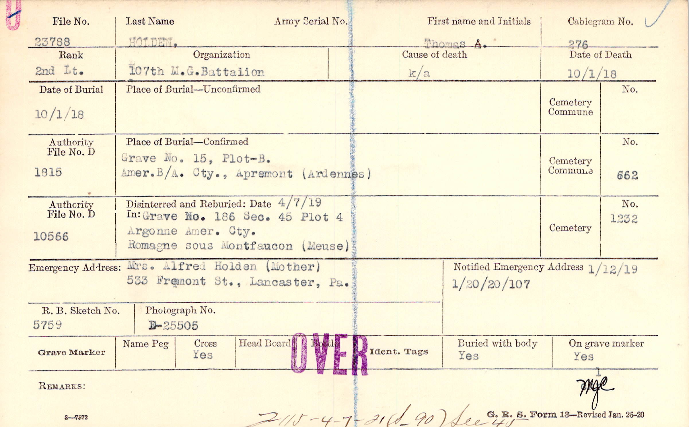 Mrs. Alfred Holden (Mother), 533 Fremont St., Lancaster, Pa.