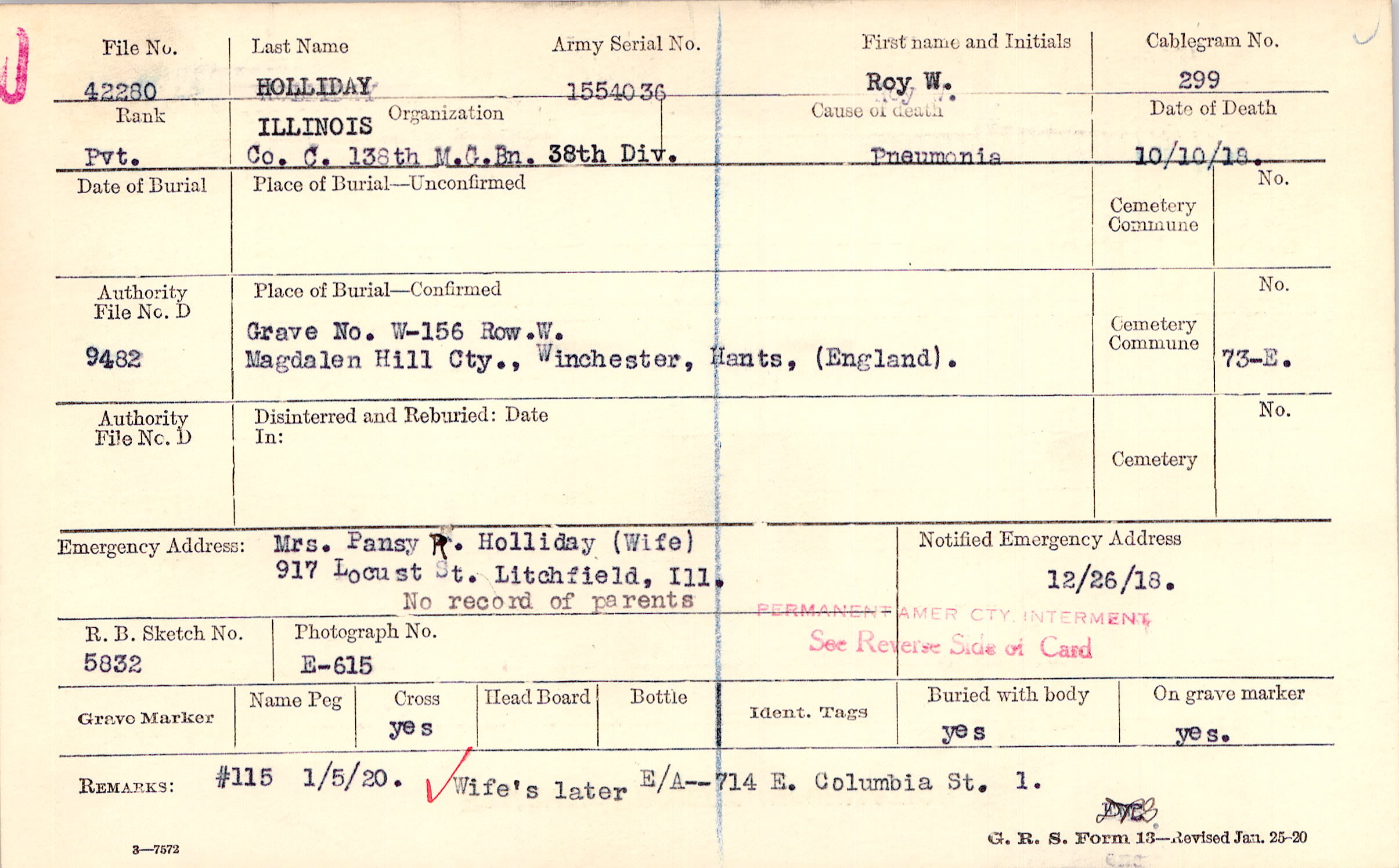 Grave W-156, Row. W., Magdalen Hill Cty., Winchester, Hants, England.