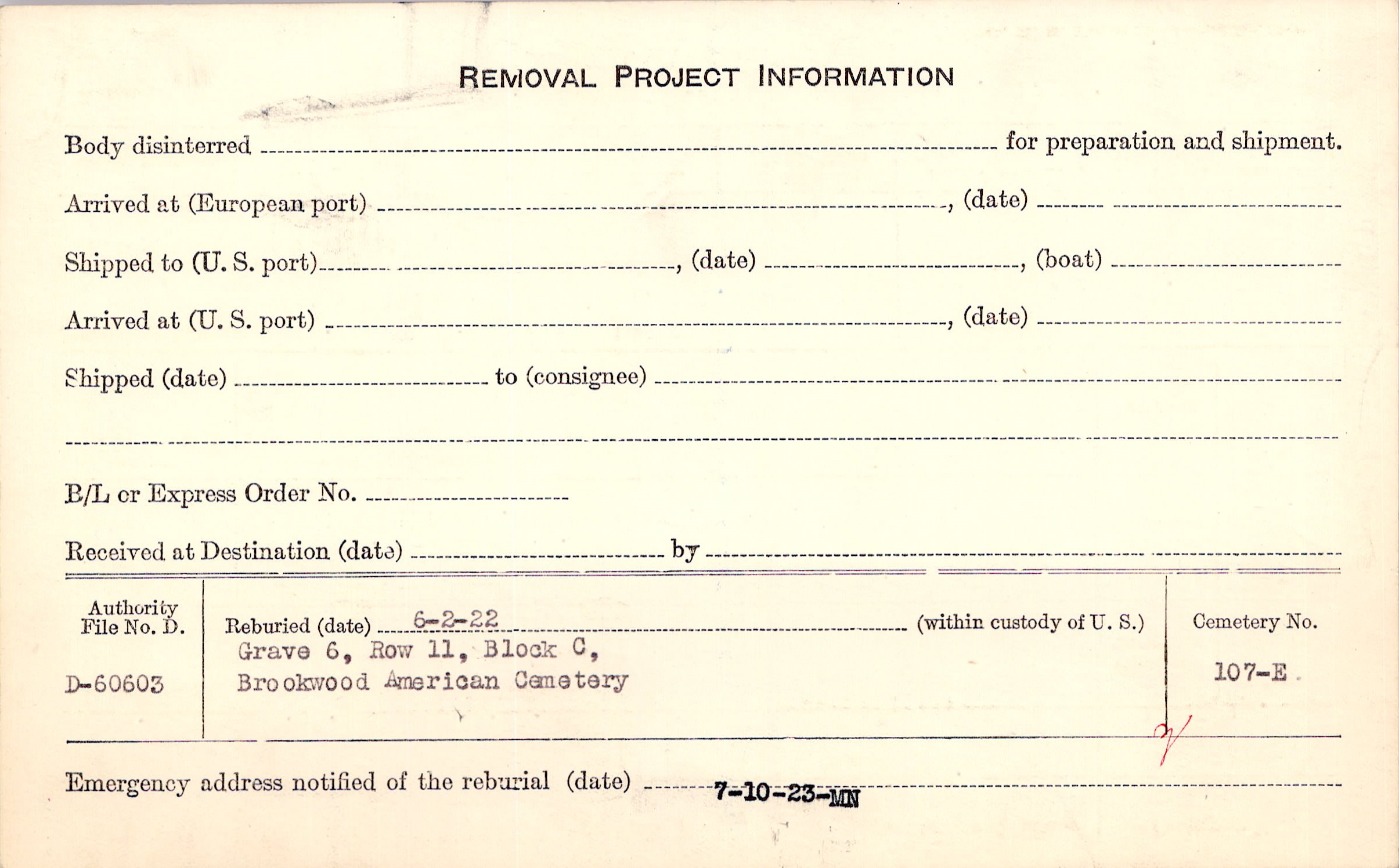 | Permanent Burial in Foreign Cemetery |