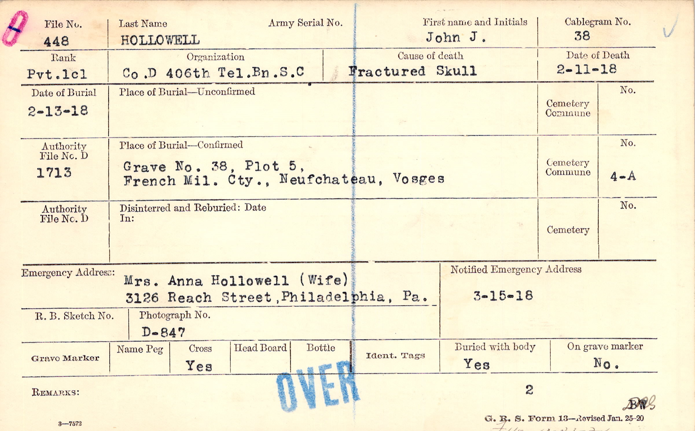 Mrs. Anna Hollowell (Wife), 3126 Reach Street, Philadelphia, Pa.