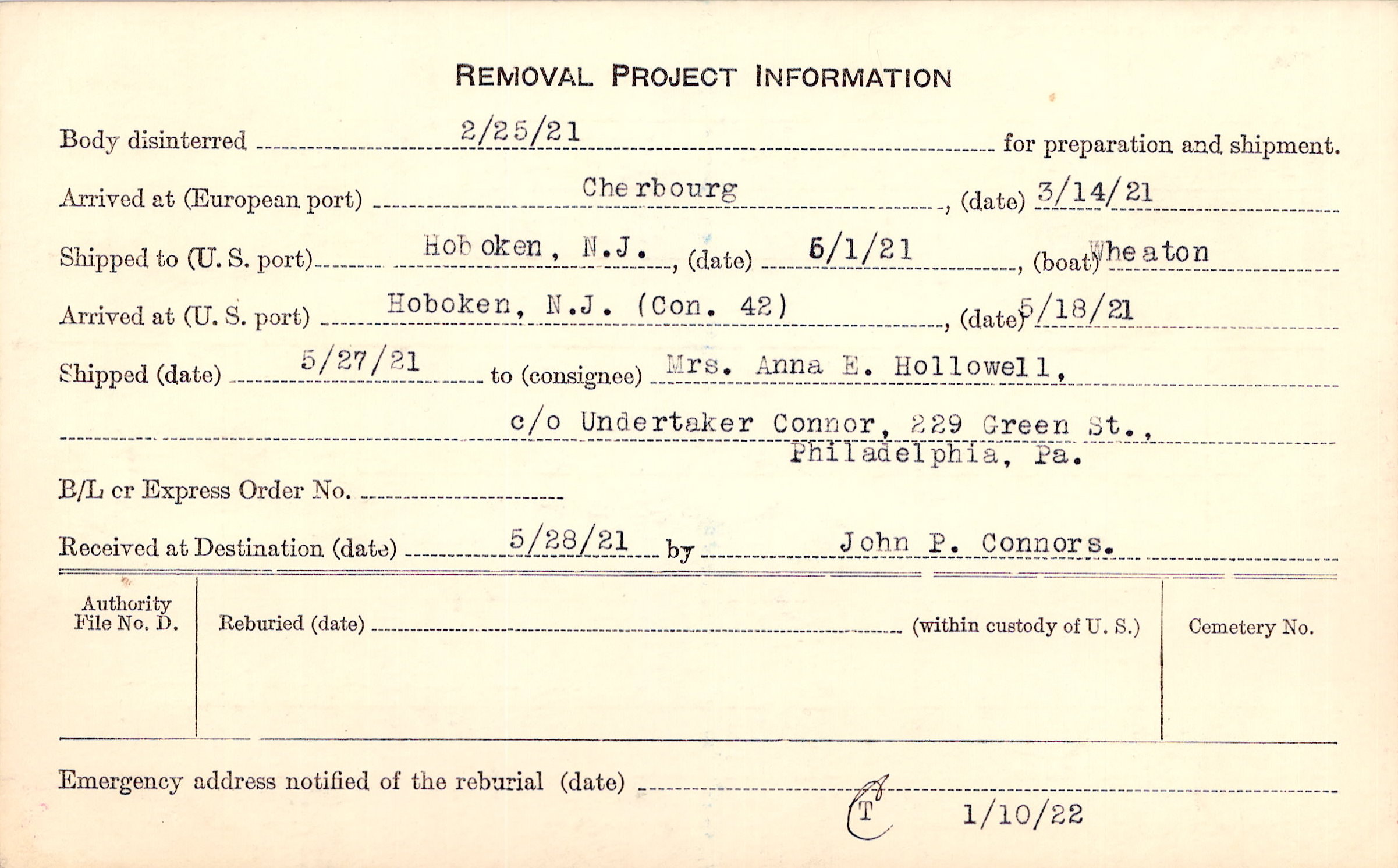 to Mrs. Anna E. Hollowell, c/o Undertaker Connor, 229 Green St., Philadelphia, Pa.