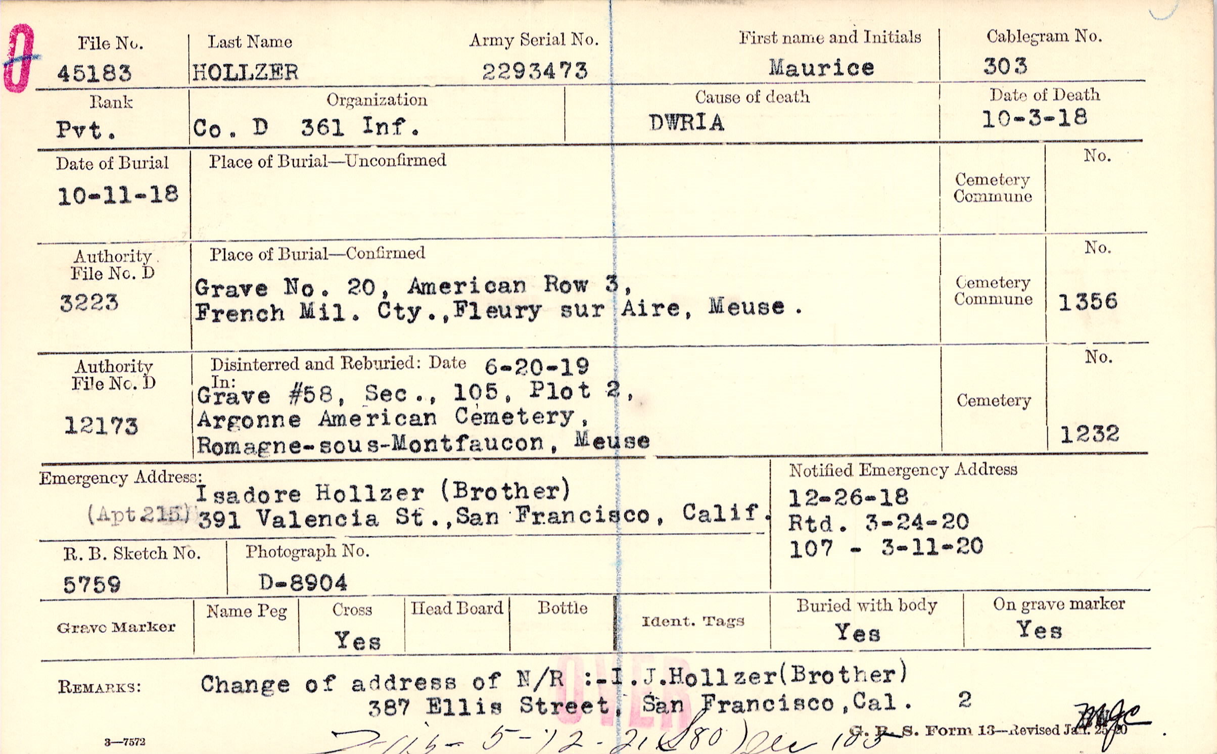 Grave 20, American Row 3, French Mil. Cty., Fleury sur Aire, Meuse.