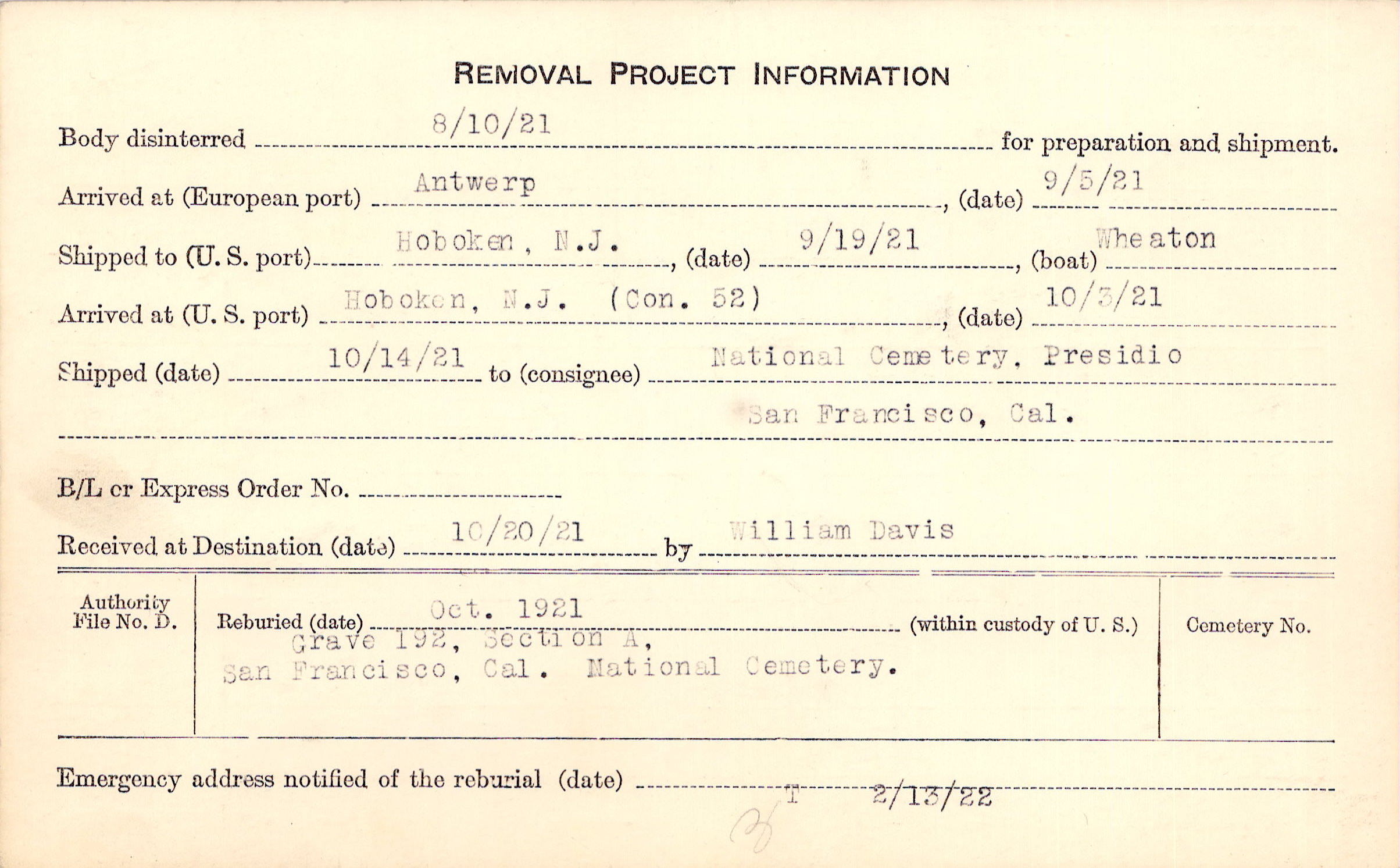 Body disinterred 8/10/1921 for preparation and shipment.