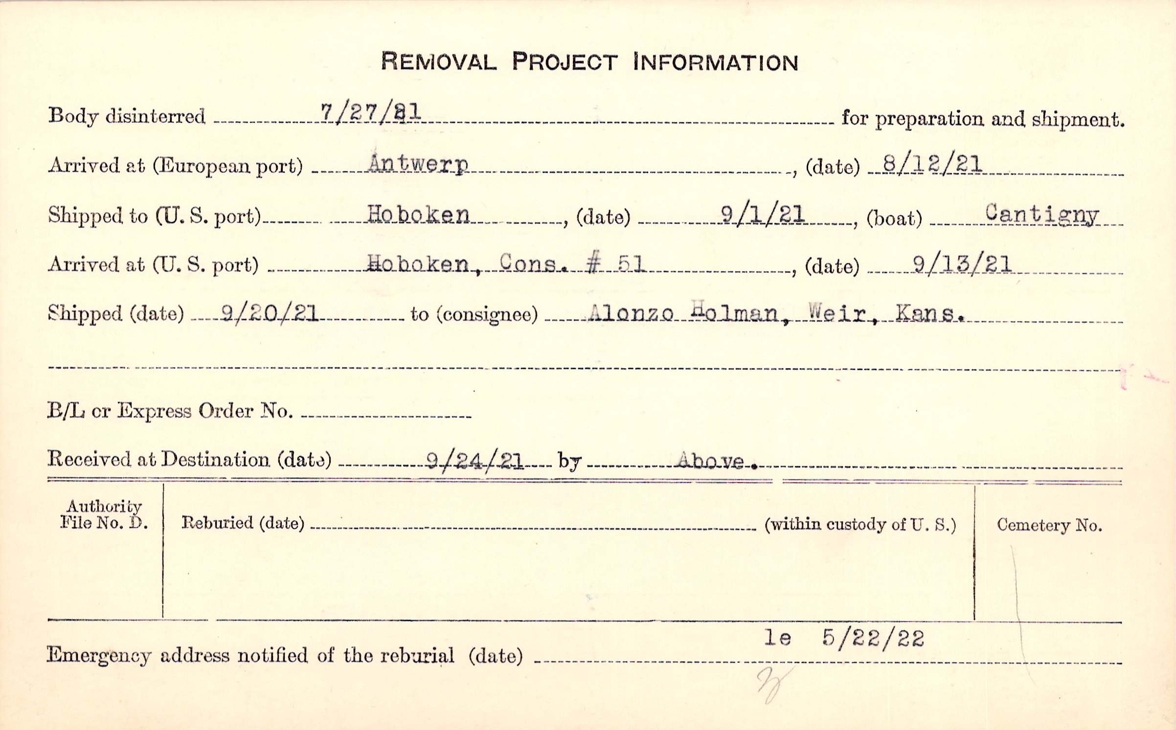 Body disinterred 7/27/1921 for preparation and shipment.