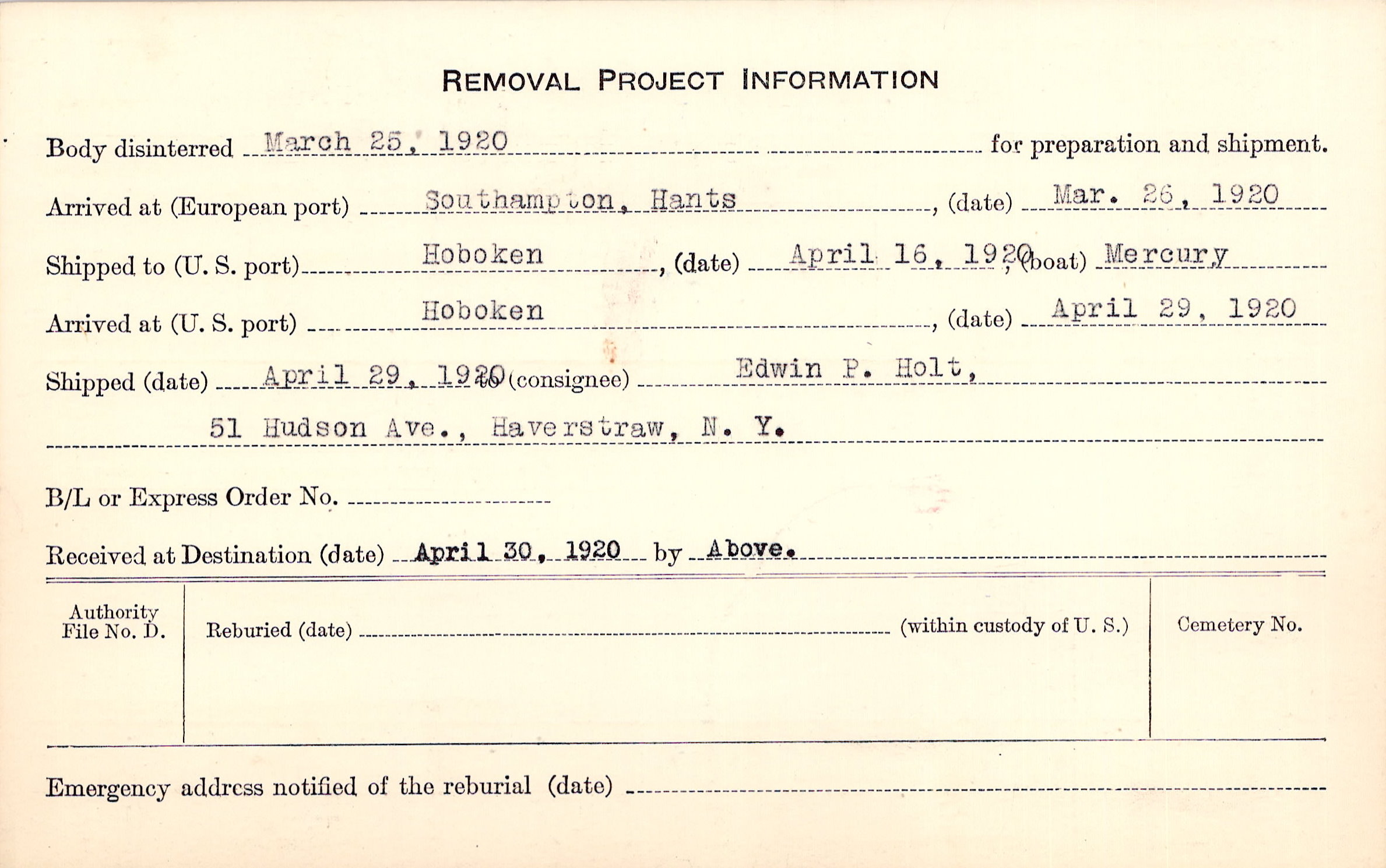 Body disinterred 3/25/1920 for preparation and shipment.