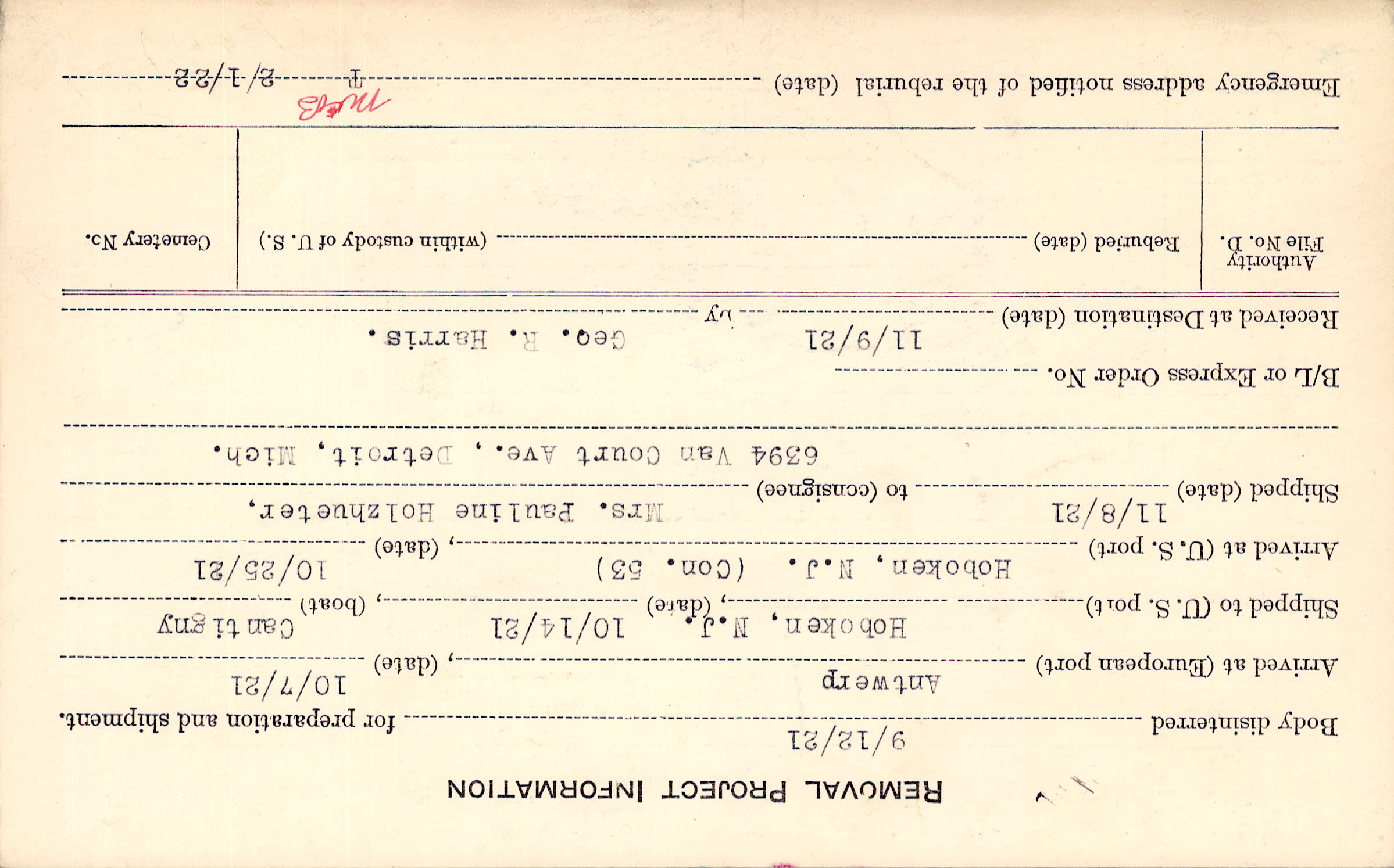 Body disinterred 9/12/1921 for preparation and shipment.