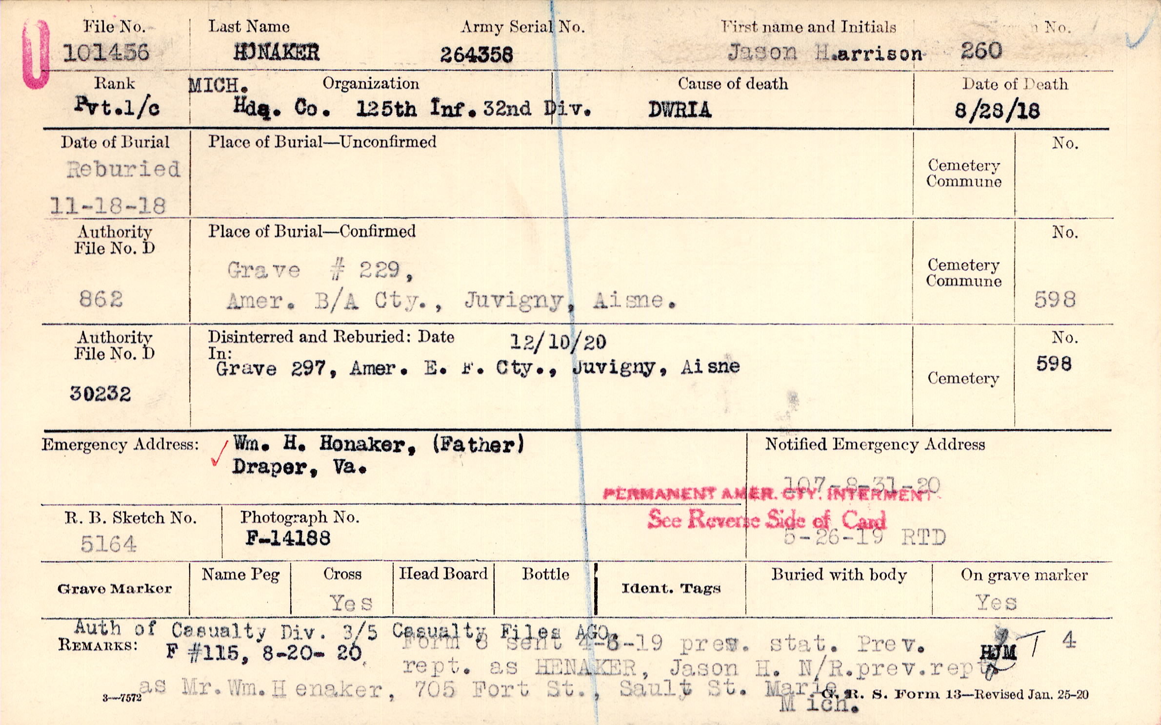 form 8 sent 4-6-19 pres. stat. Prev. rept. as HENAKER, Jason H. N/R. prev. rept. as Mr. Wm. H enaker, 705 Fort St., Sault st., marie, Mich. auth of Casualty Div. 3/5 Casualty Files AGO, F #115, 8-20-20