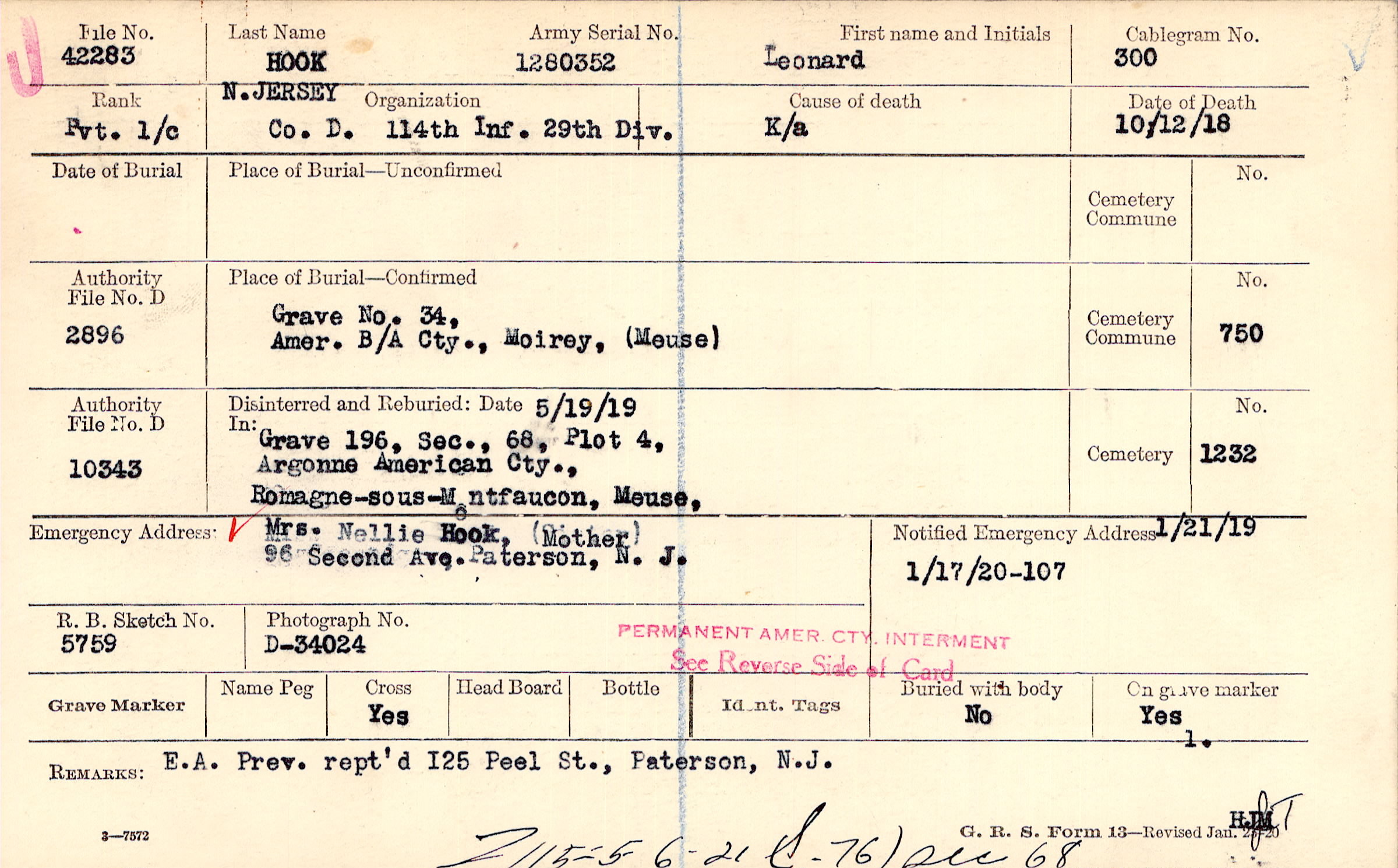 Mrs. Nellie Hook, (Mother), 96 Second Ave. Paterson, N.J.