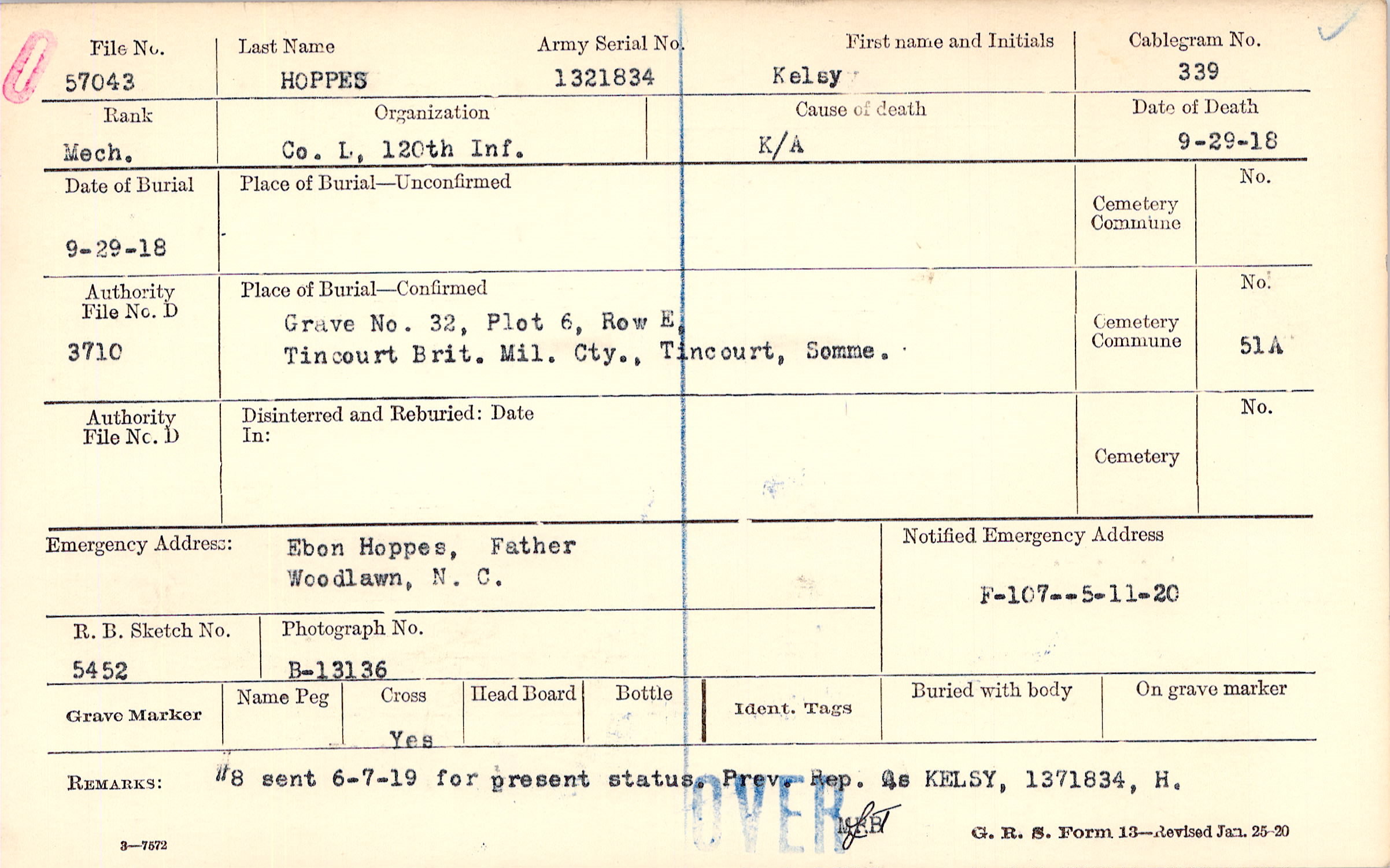 Grave 32, Plot 6, Row E, Tincourt Brit. Mil. Cty., Tincourt, Somme.