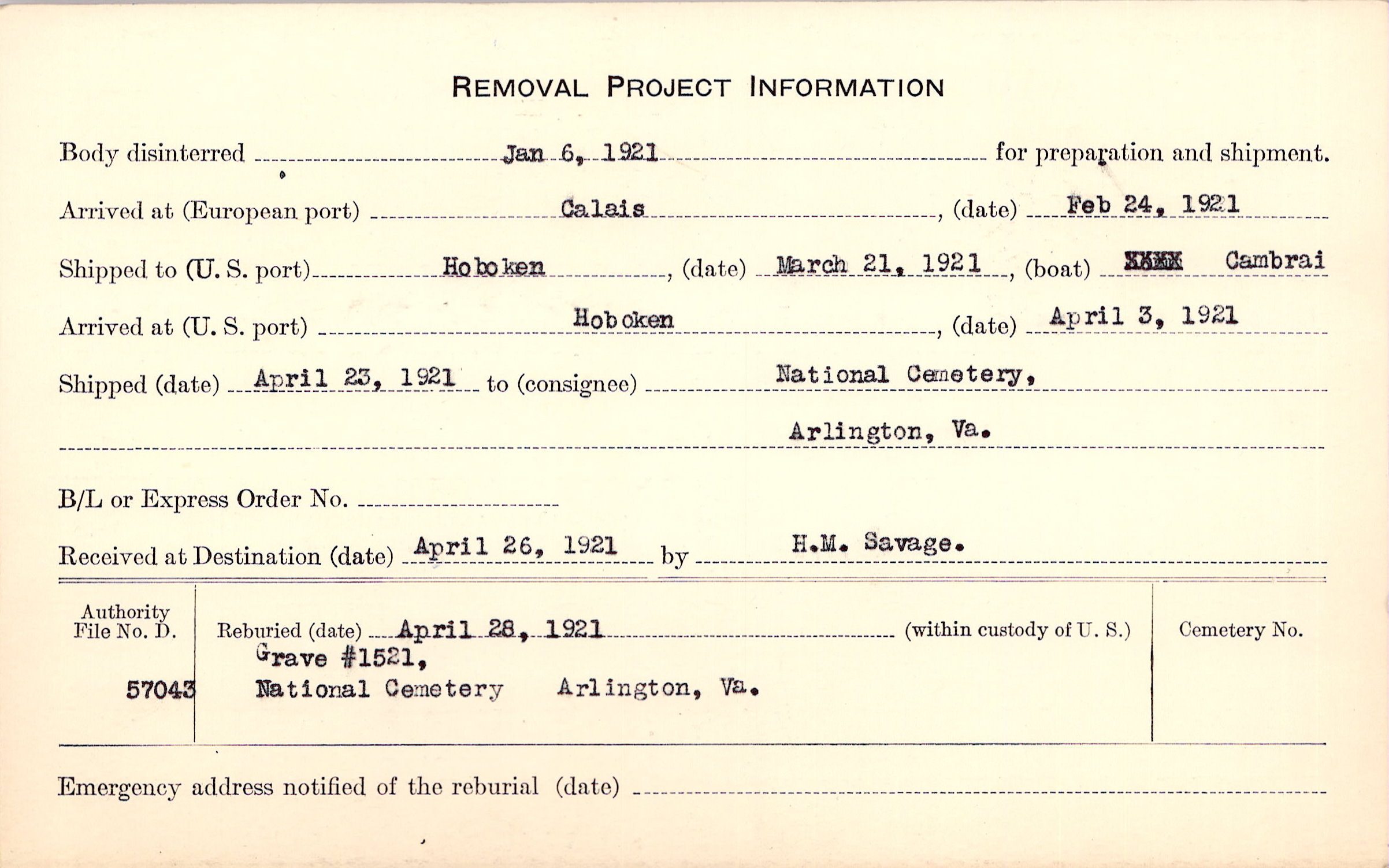 Body disinterred 1/6/1921 for preparation and shipment.