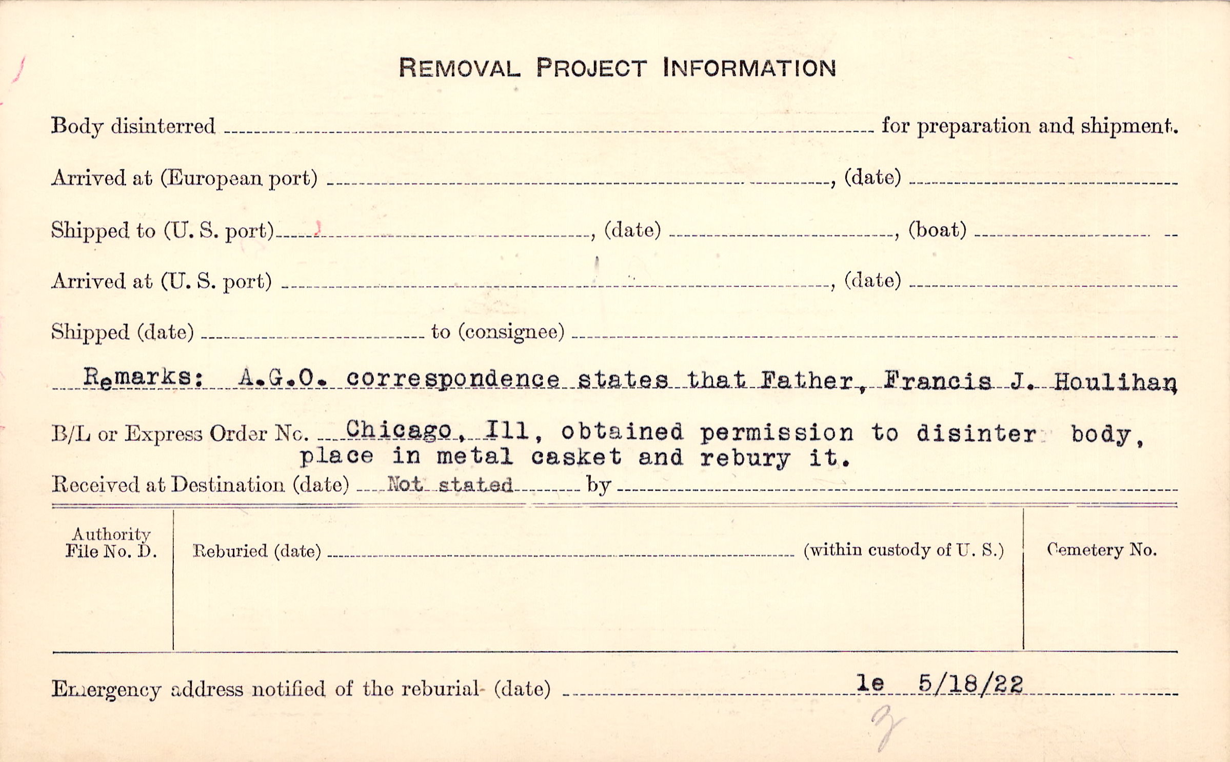 to Remarks: A.G.O. correspondence states that Father, Francis J. Houlihan, Chicago, Ill, obtained permission to disinter body, place in metal casket and rebury it.