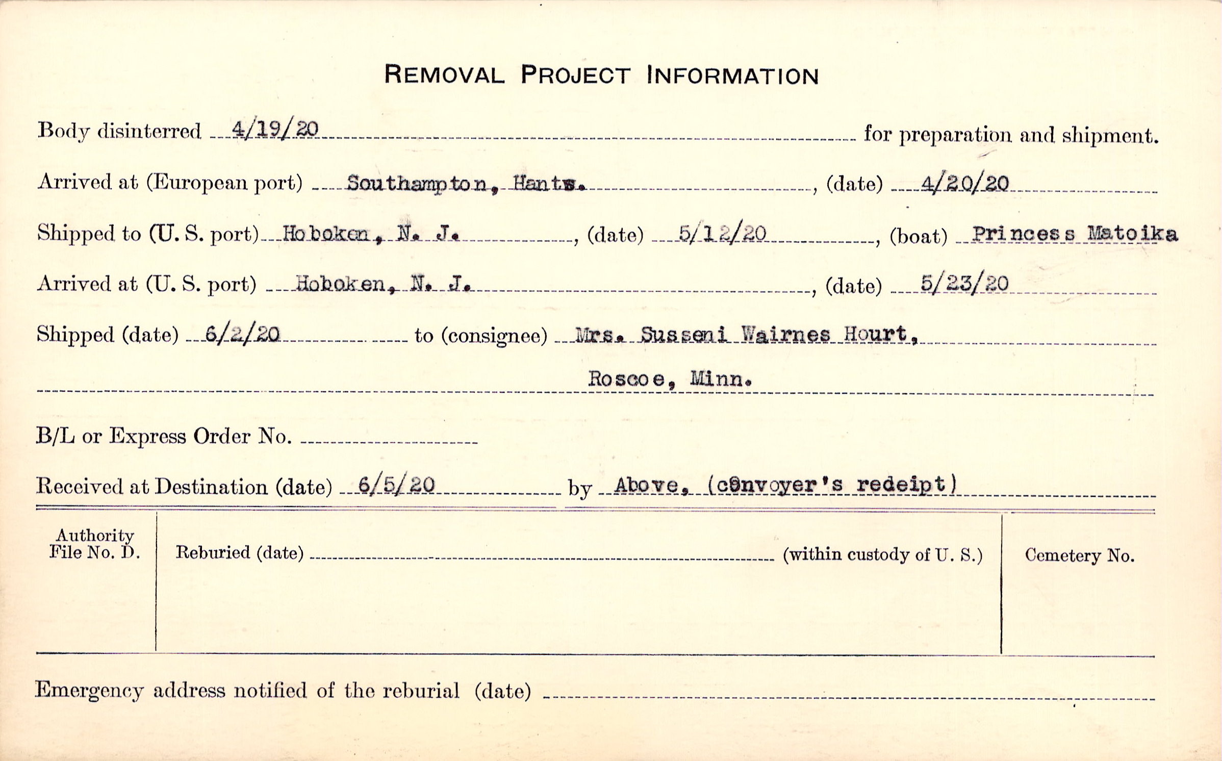 Body disinterred 4/19/1920 for preparation and shipment.
