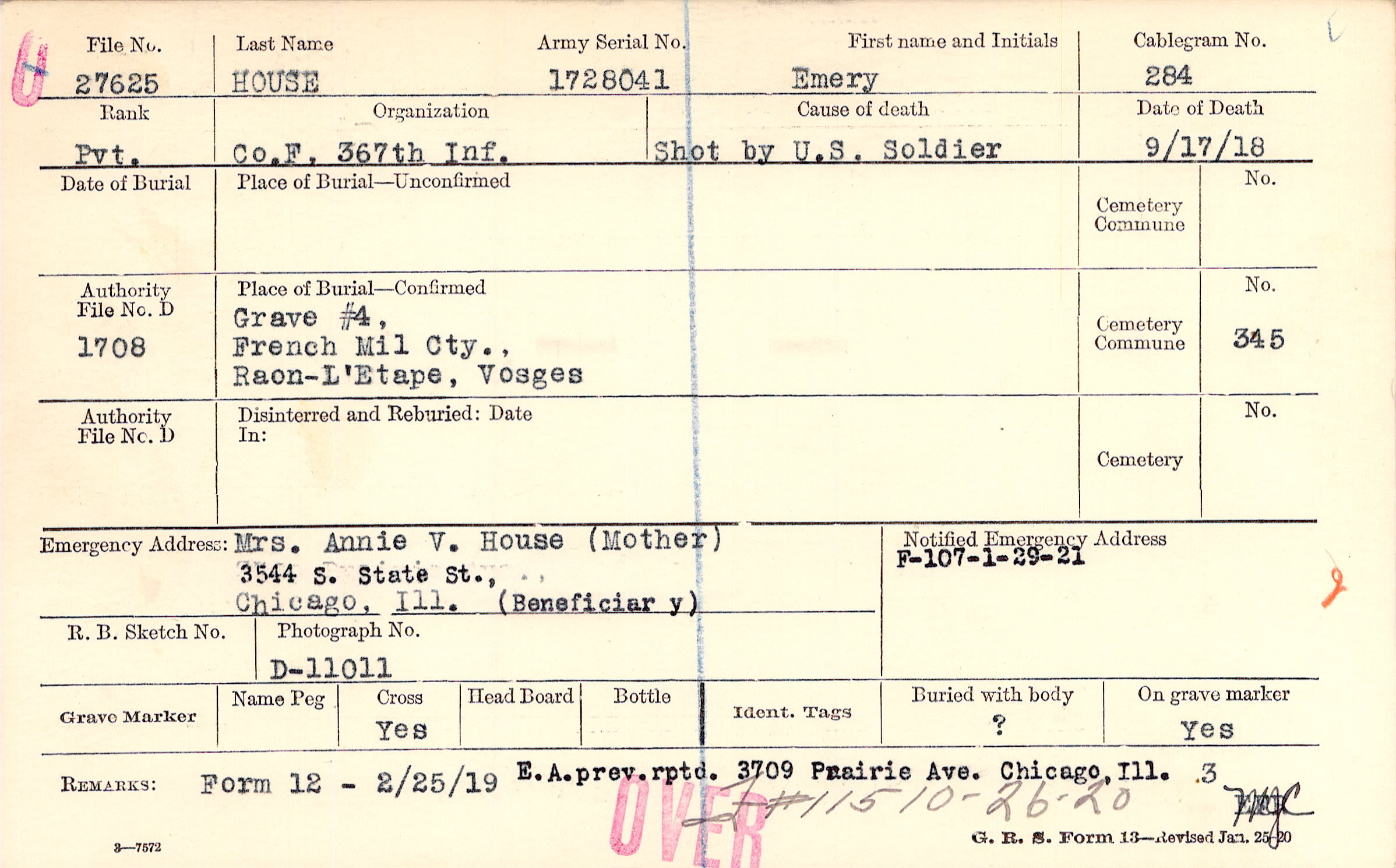 Mrs. Annie V. House (Mother), 3544 S. State St., Chicago, Ill., (Beneficiary)