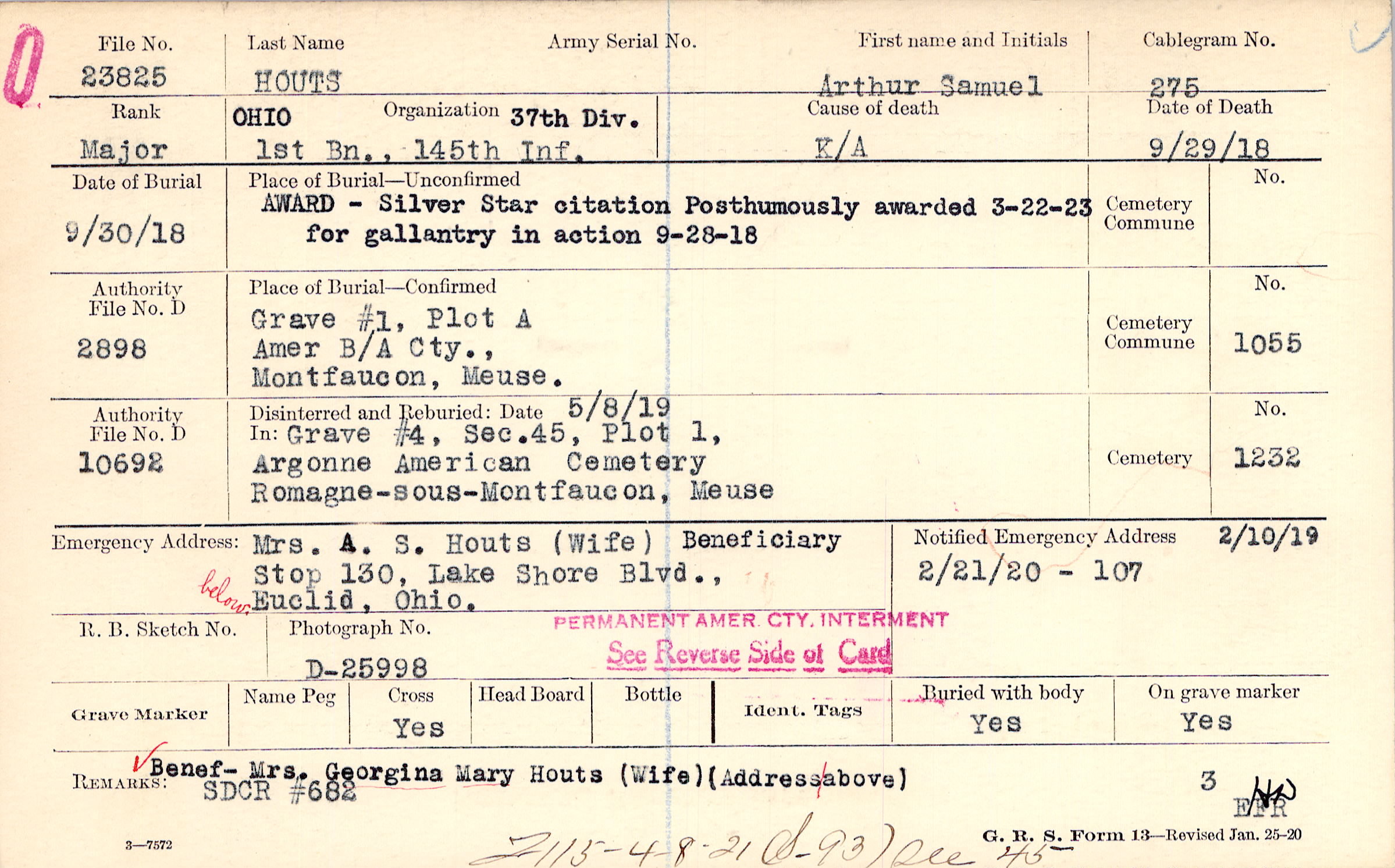 Mrs. A. S. Houts (Wife) Beneficiary, Stop 130, Lake Shore Blvd., Euclid, Ohio., below