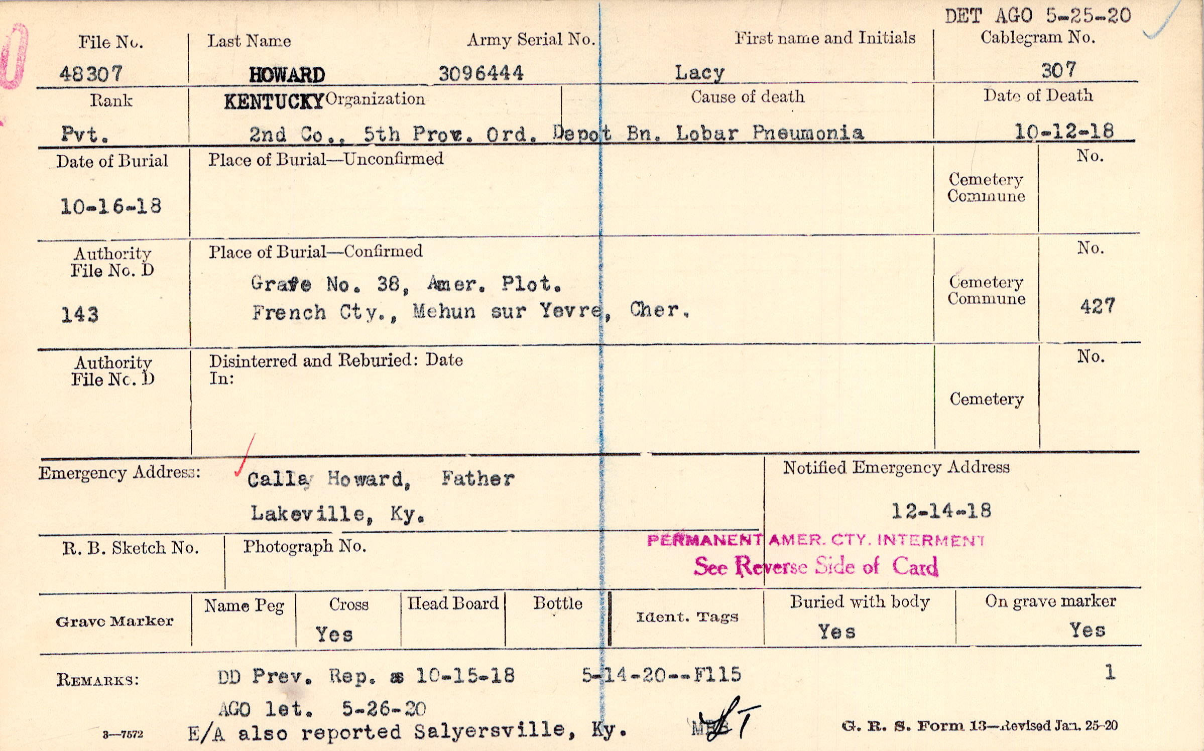 Grave 38, Amer. Plot., French Cty., Mehun sur Yevre, Cher