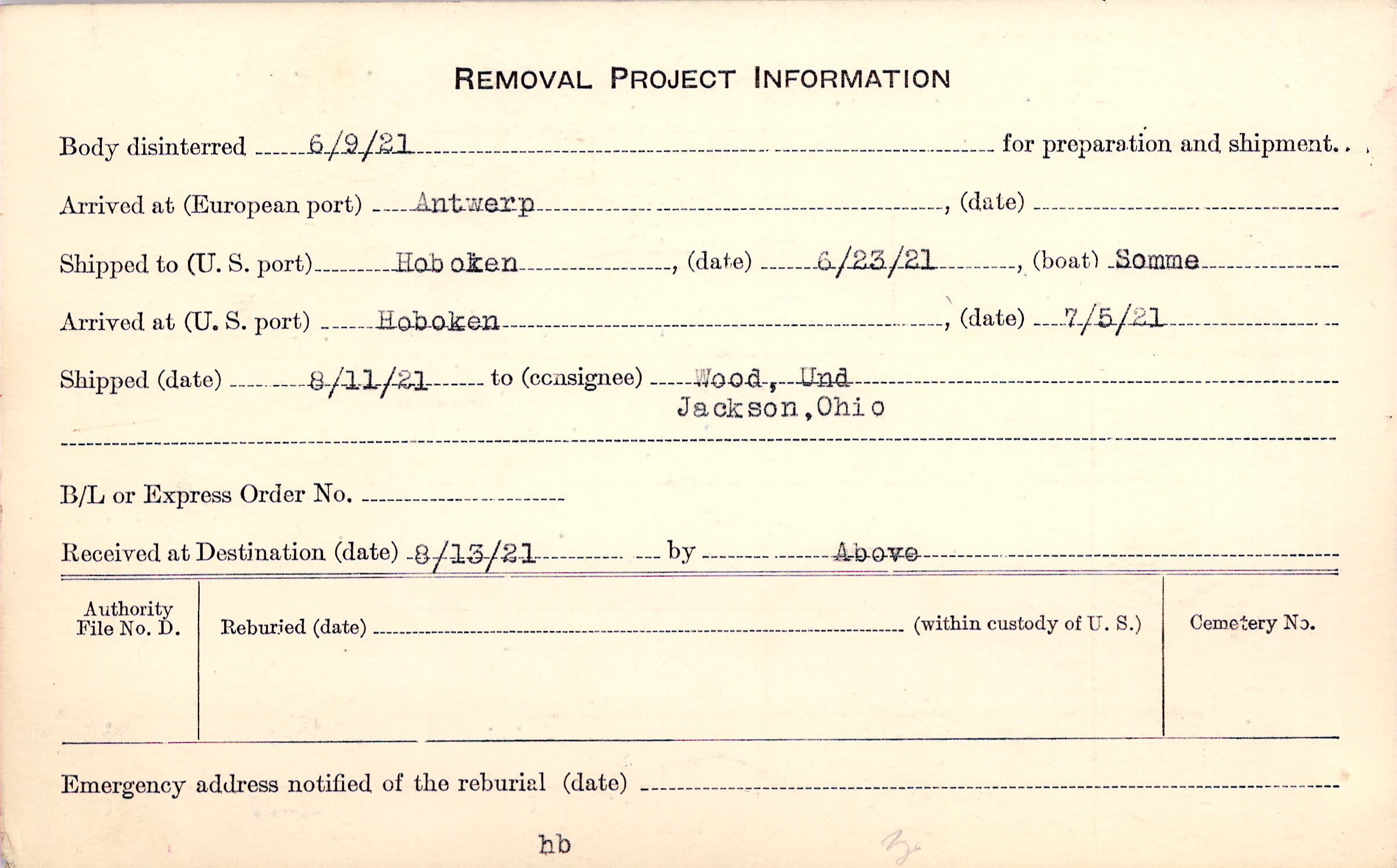 Body disinterred 6/9/1921 for preparation and shipment.