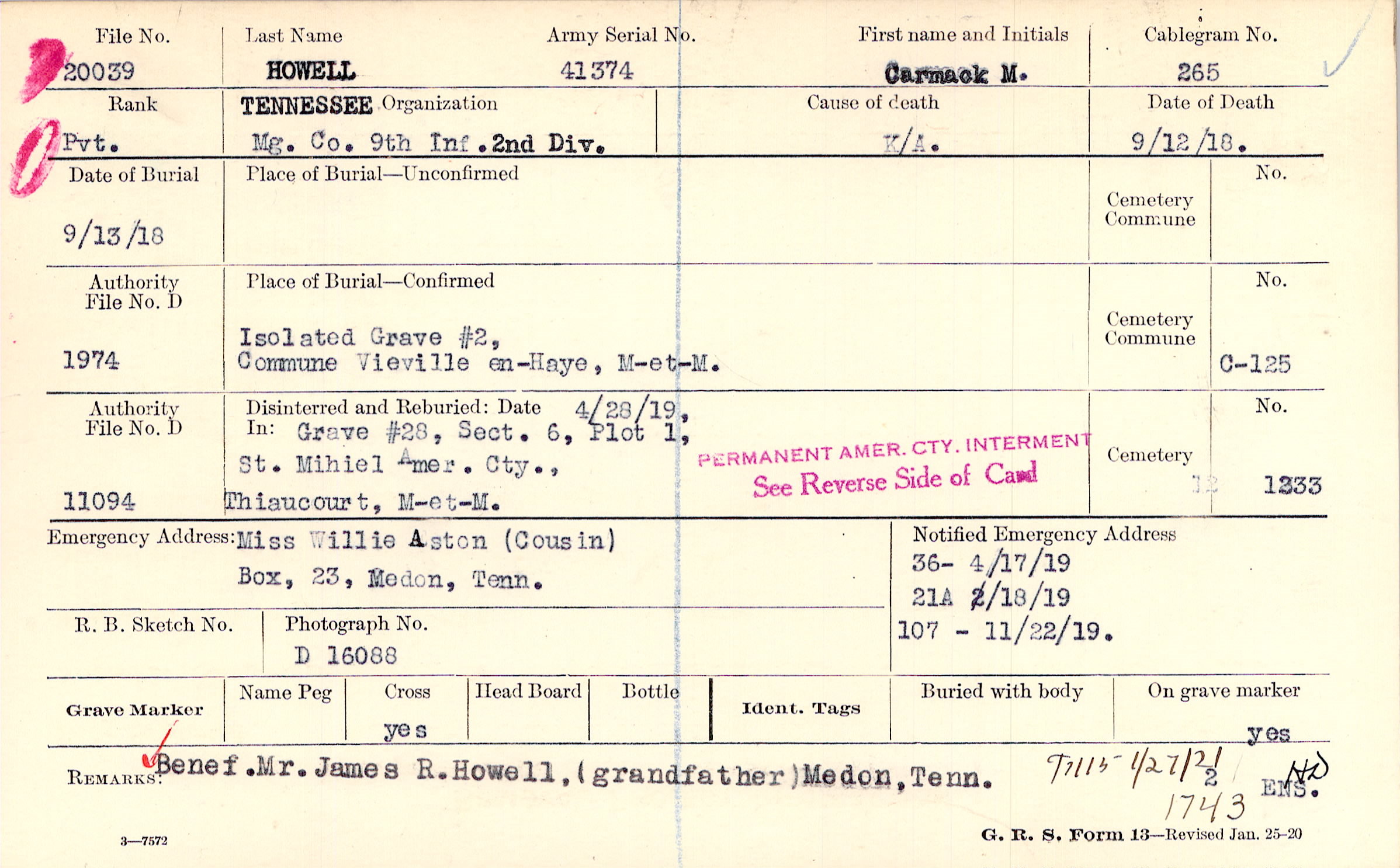 Isolated Grave #2, Commune Vieville en Haye, M-et-M.,#Reburied 4/28/19, Grave #28, Sect. 6, Plot 1, St Mihiel, Amer. City., Thisucourt, M-etM.