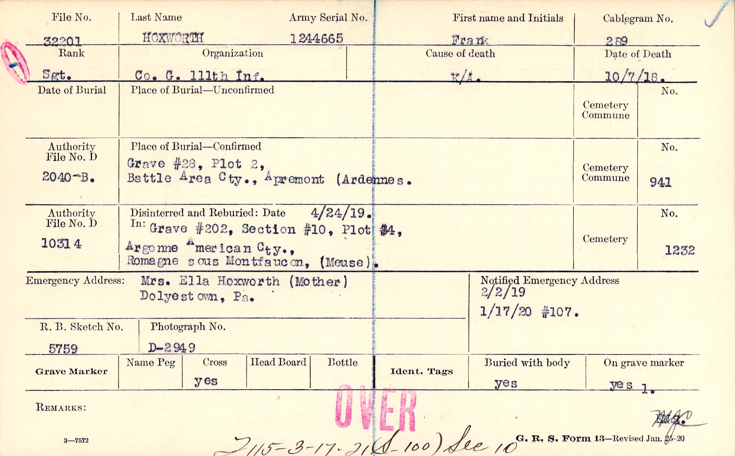 Grave #28, Plot 2, Battle Area Cty., Apremont, Ardennes.