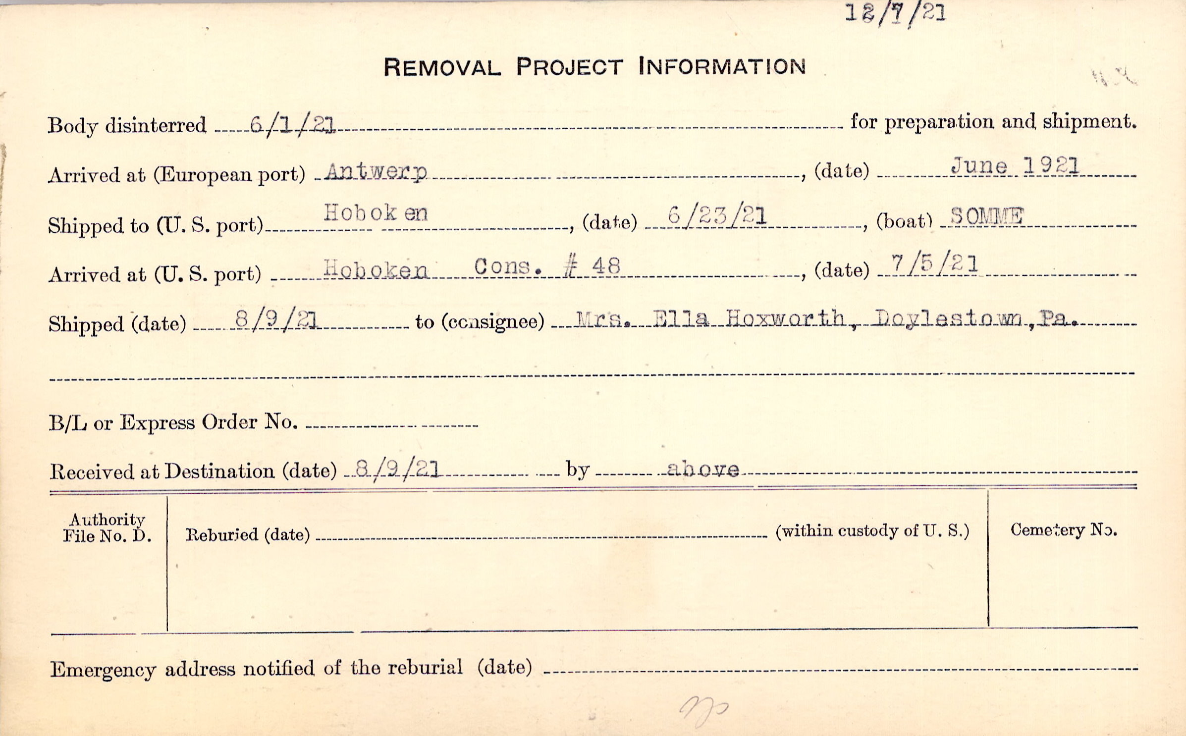 Body disinterred 6/1/1921 for preparation and shipment.