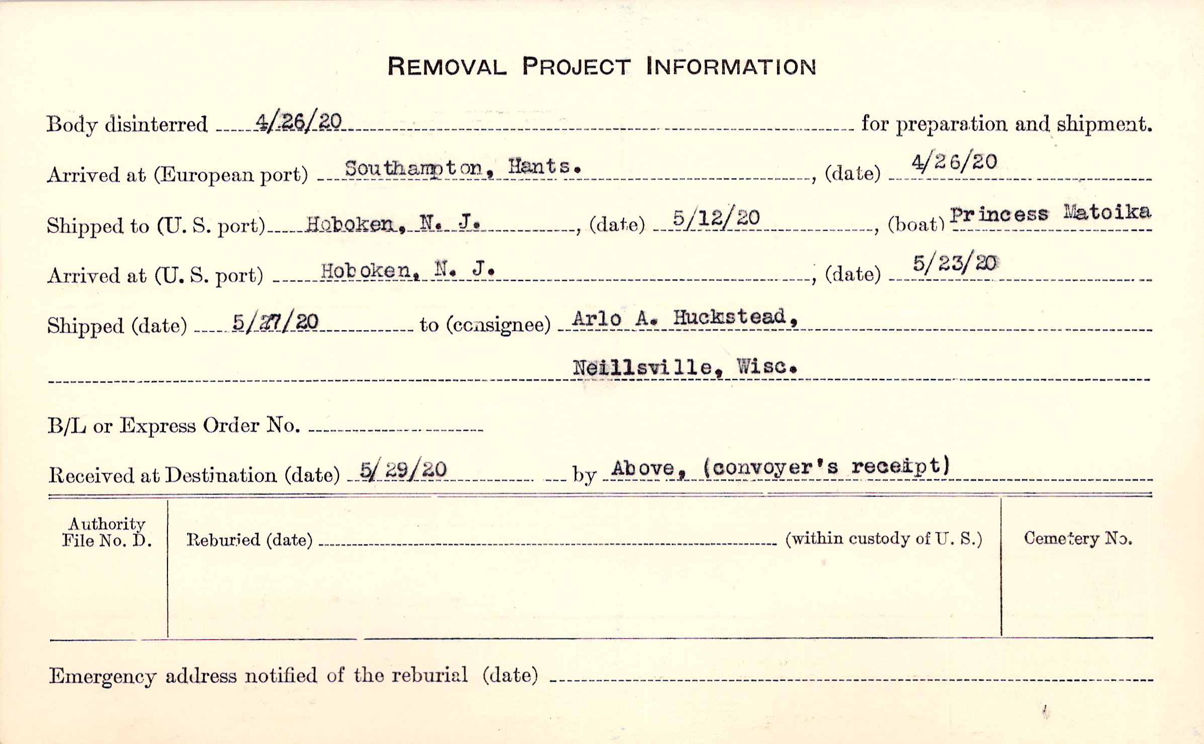 Body disinterred 4/26/1920 for preparation and shipment.