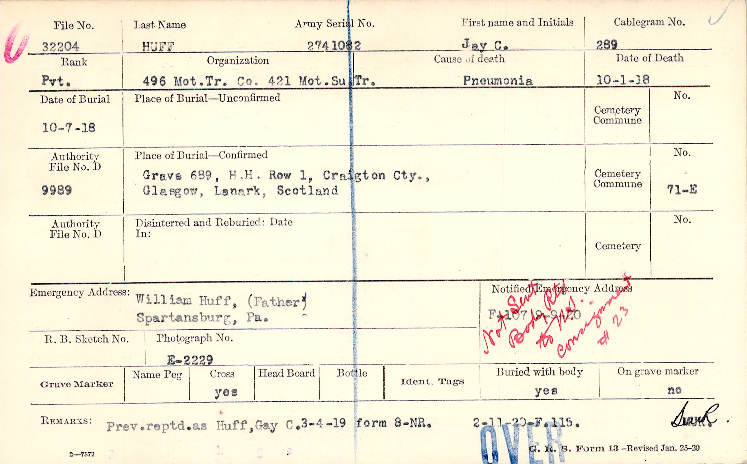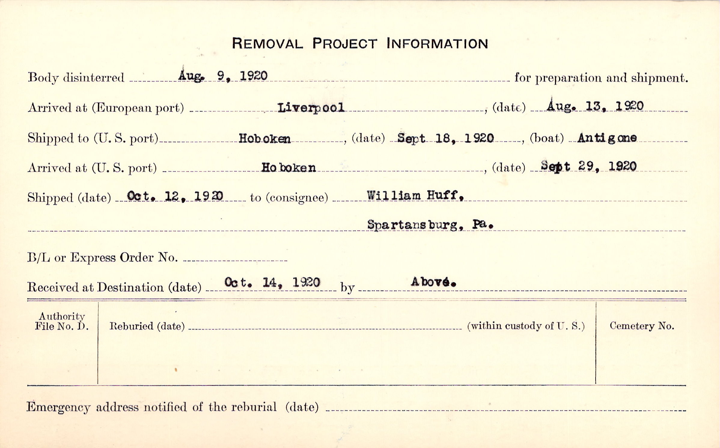 William Huff, (Father), Spartansburg, Pa., Not sent Body Rtd to US Consignment #23