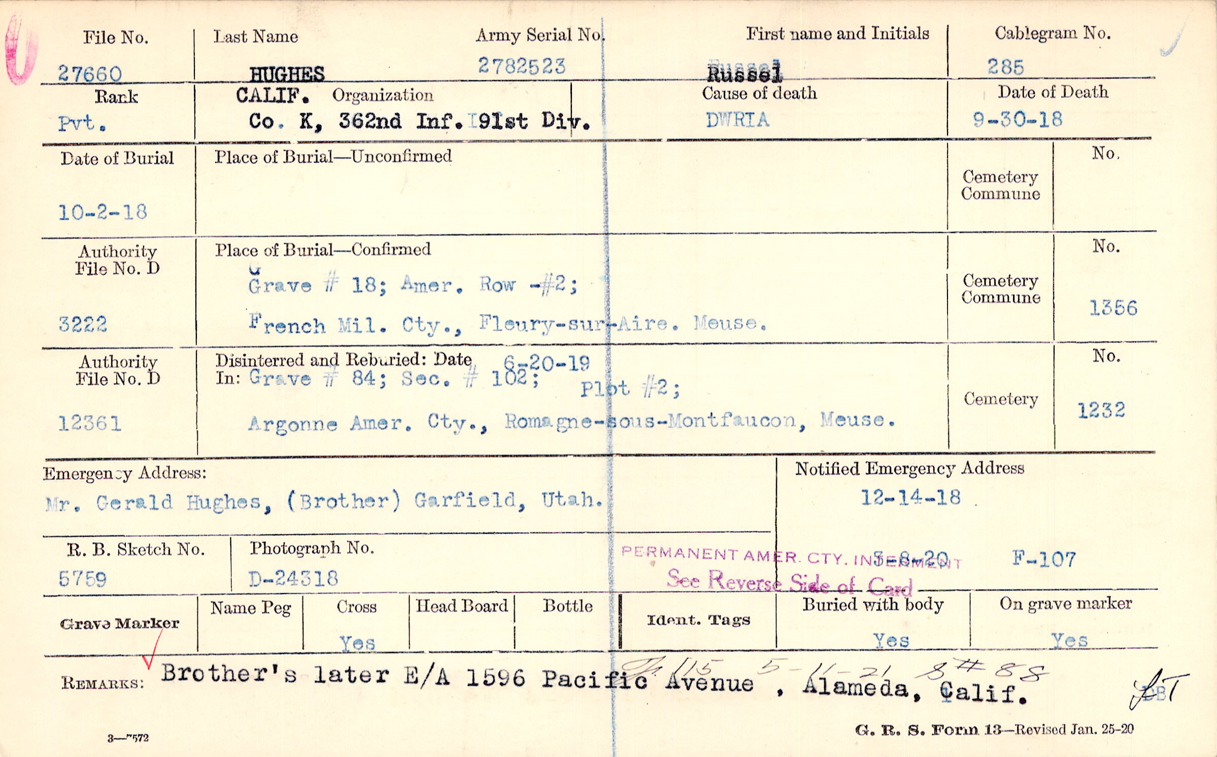 Mr. Gerald Hughes, (Brother), Garfield, Utah., Brother's later E/A 1596 Pacific Avenue , Alameda, Calif.