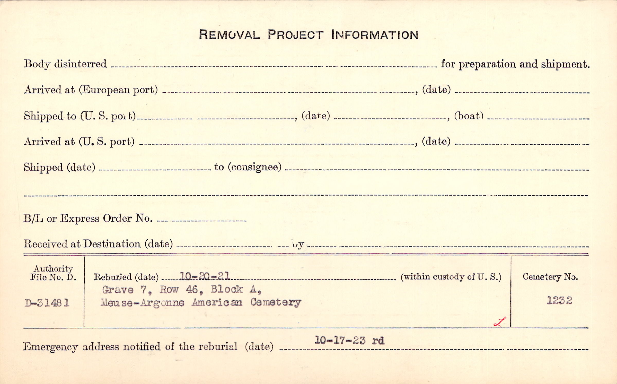 | Permanent Burial in Foreign Cemetery |
