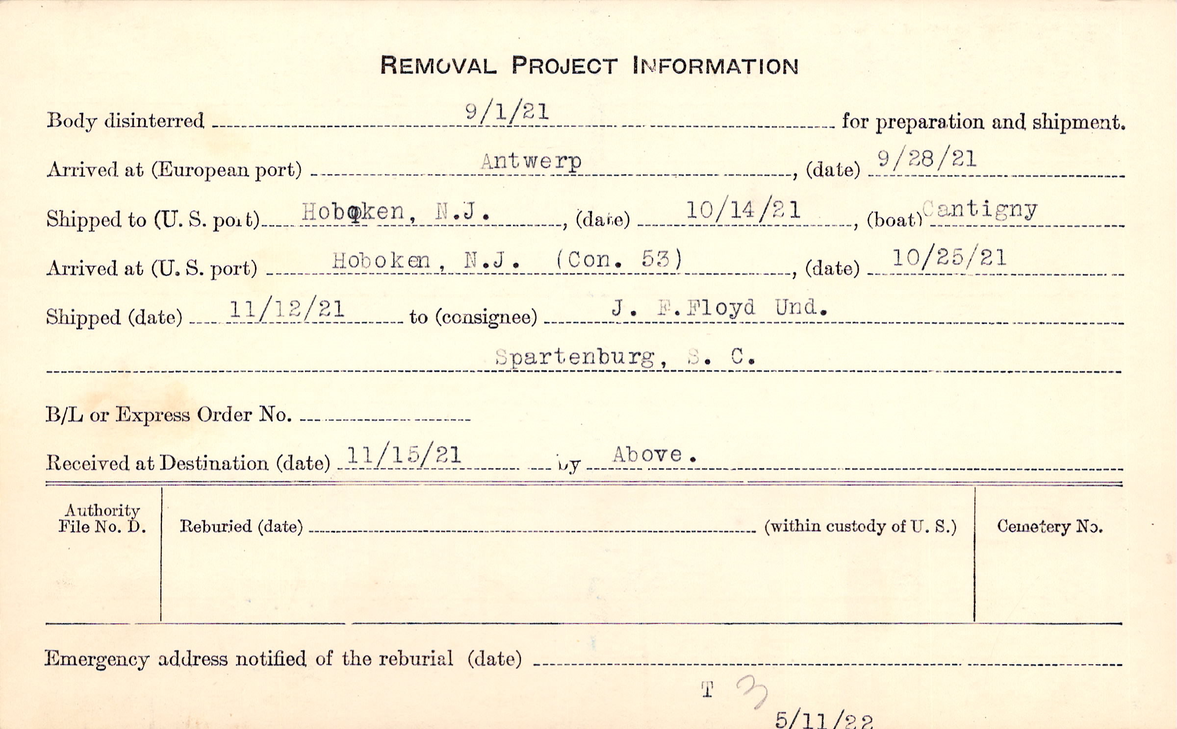 Body disinterred 9/1/1921 for preparation and shipment.