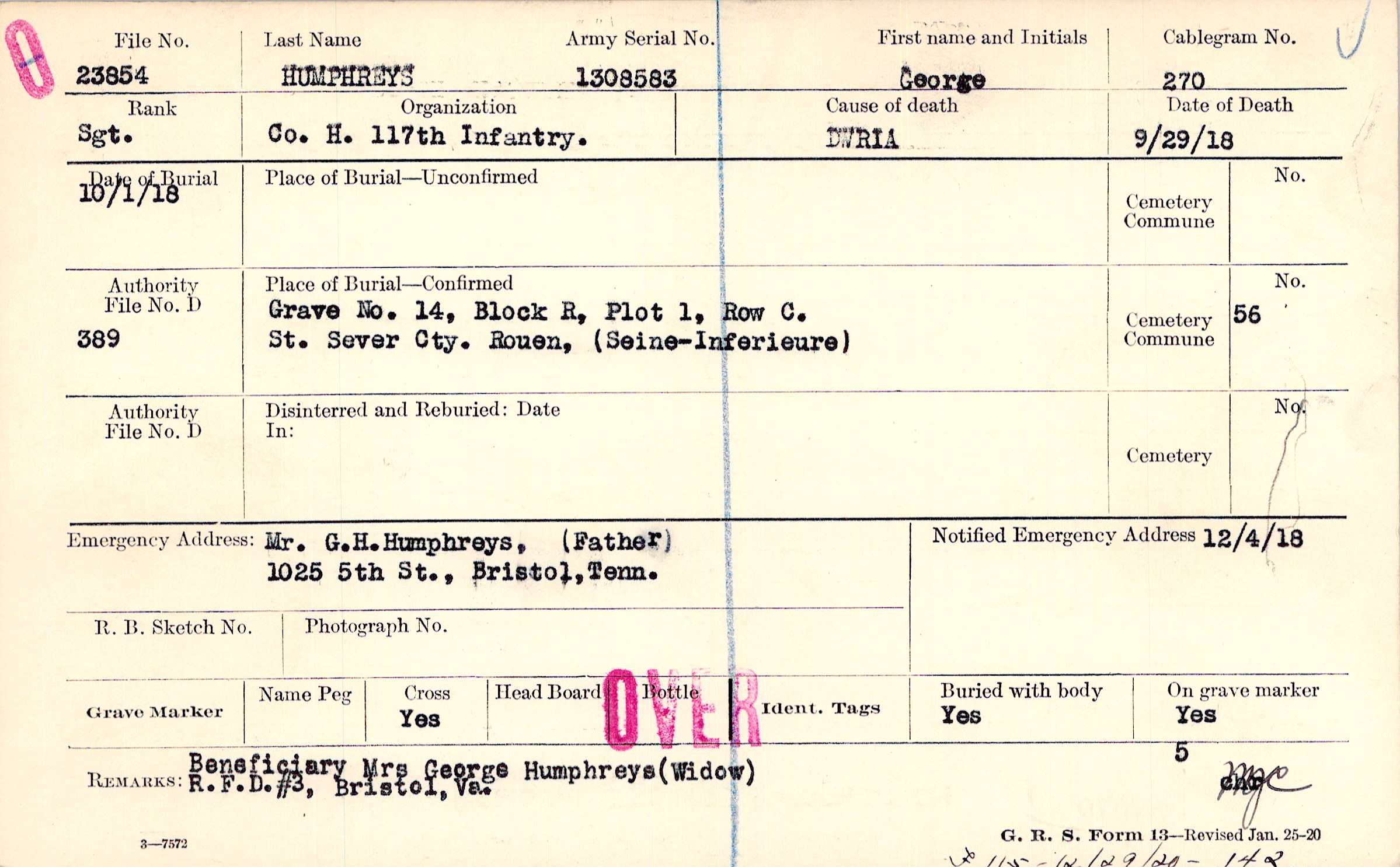 beneficiary Mrs George Humphreys (Widow) R.F.D.#3, Bristol, Va.