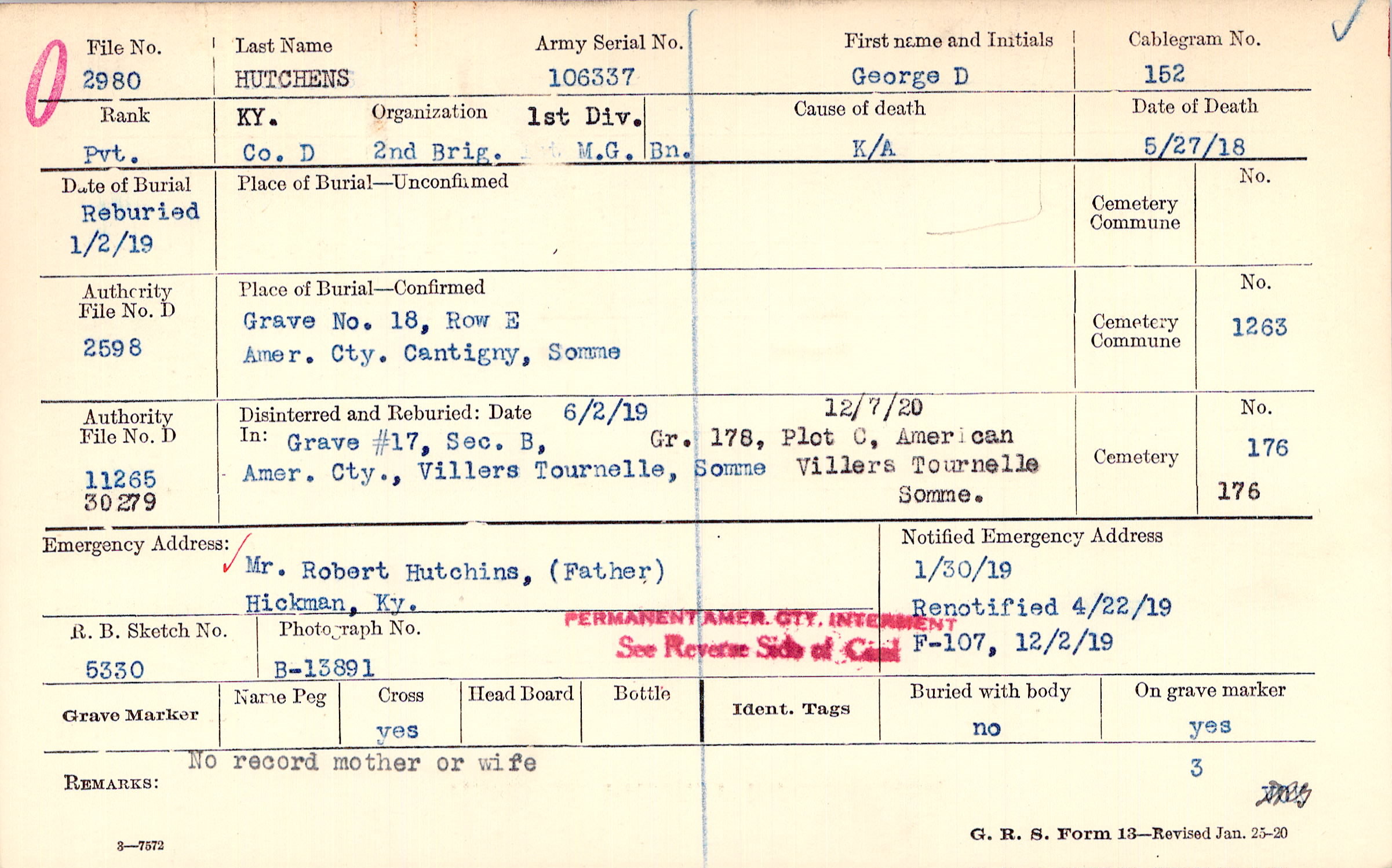 Mr. Robert Hutchins, (Father), Hickman, Ky., No record of mother or wife