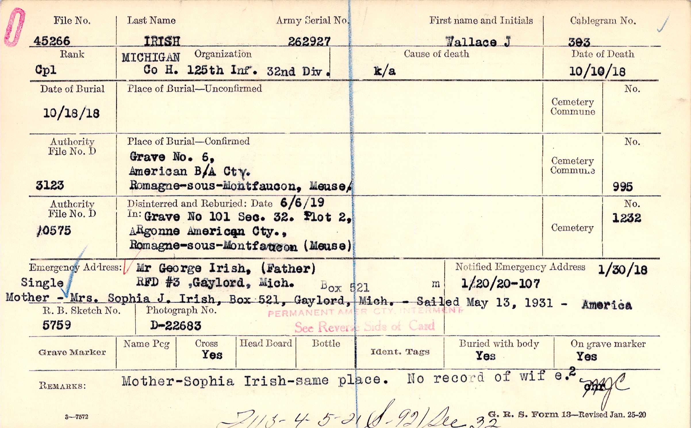 Mother - Sophia Irish - same place No record of wife, F 115- 4-5-21 (S-92) Sec 32