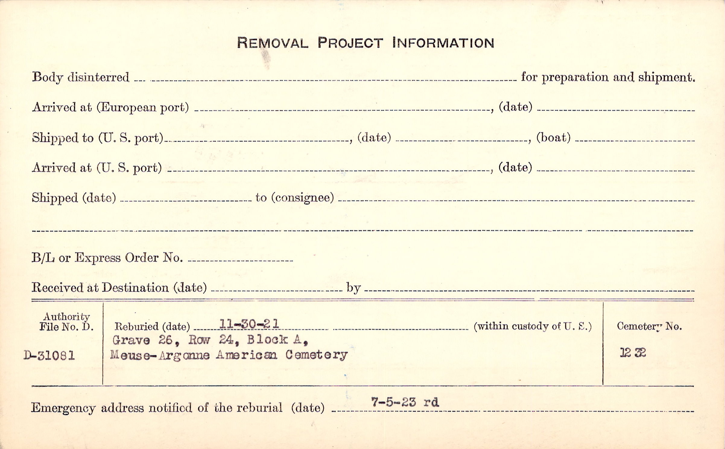 | Permanent Burial in Foreign Cemetery |