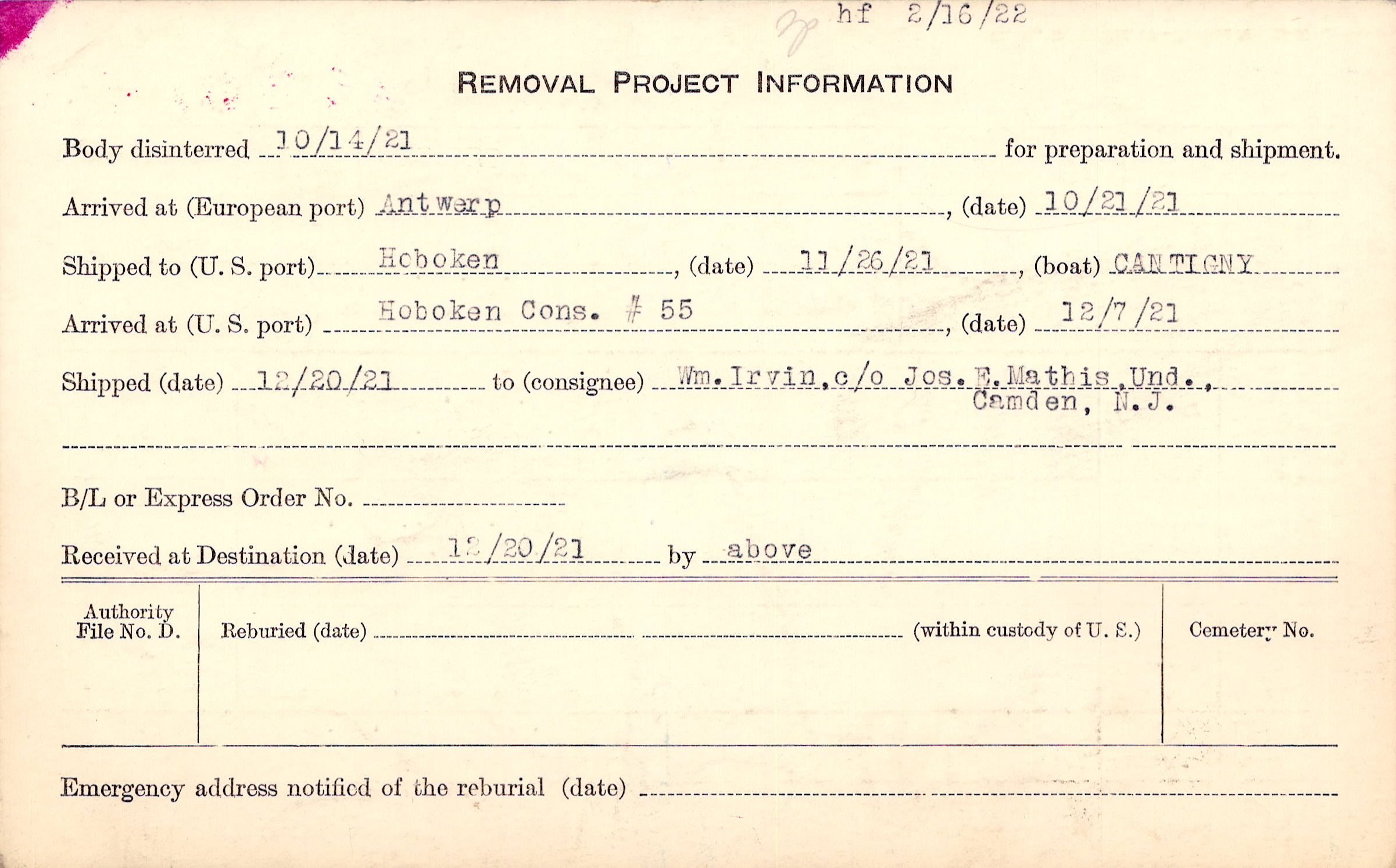 Body disinterred 10/14/1921 for preparation and shipment.