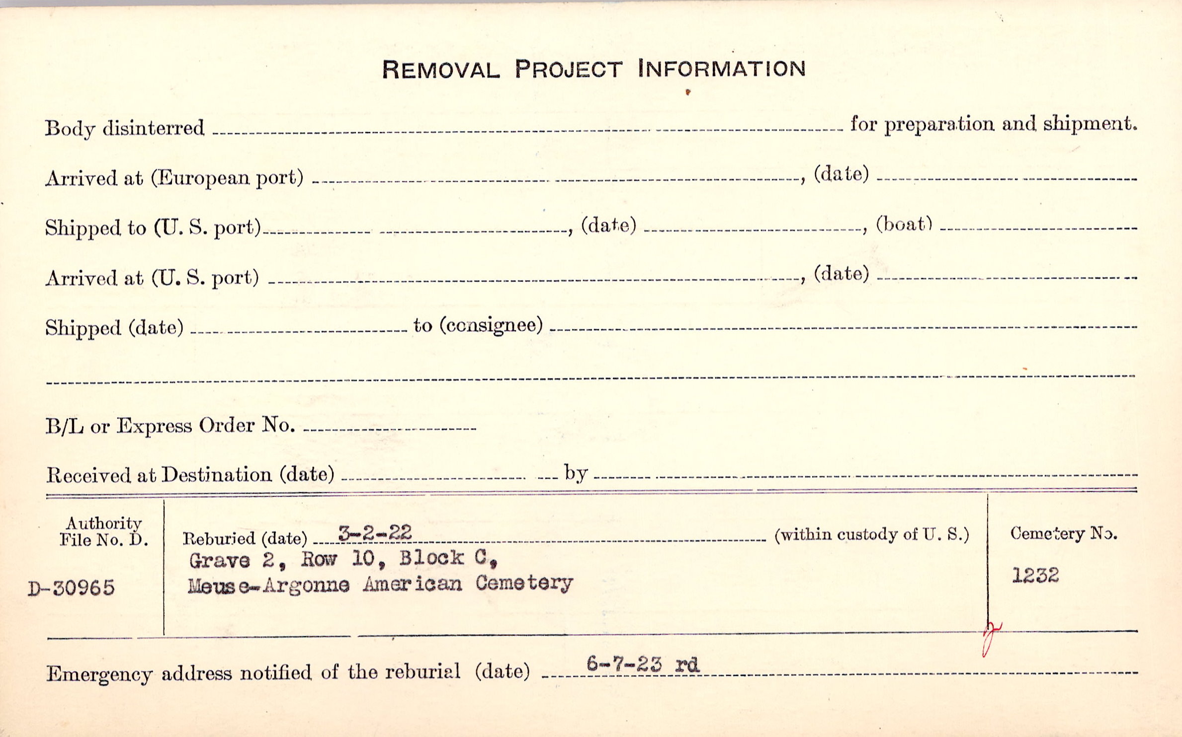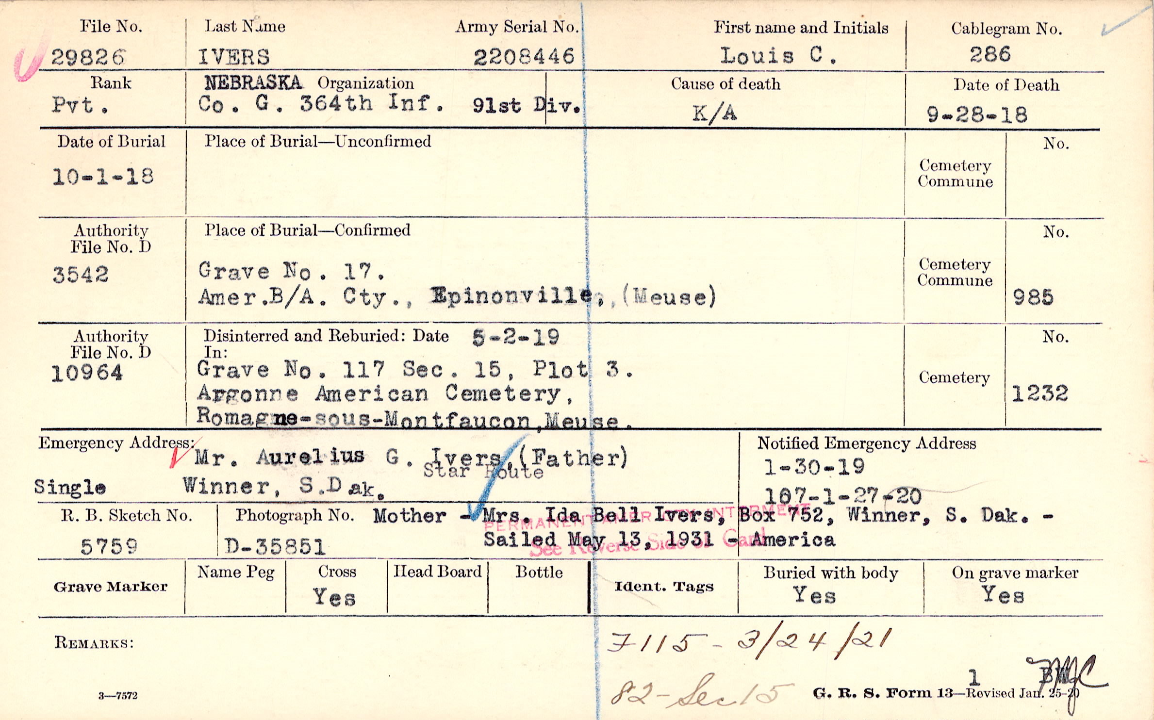 Grave 117, Section 15, Plot 3, Argonne American Cemetery, Romagne-sous-Montfaucon, Meuse