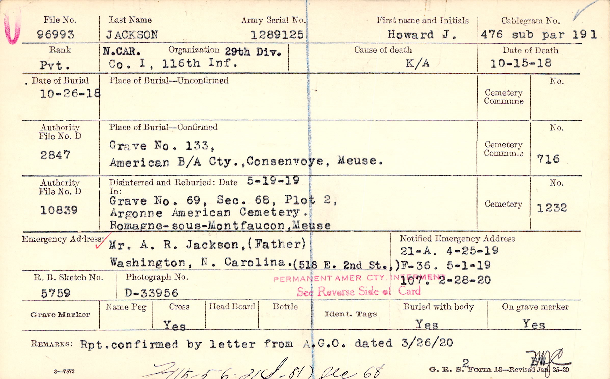 Mr. A. R. Jackson, (Father), Washington, N. Carolina. (518 E. 2nd St.,), (518 E. 2nd St.,)