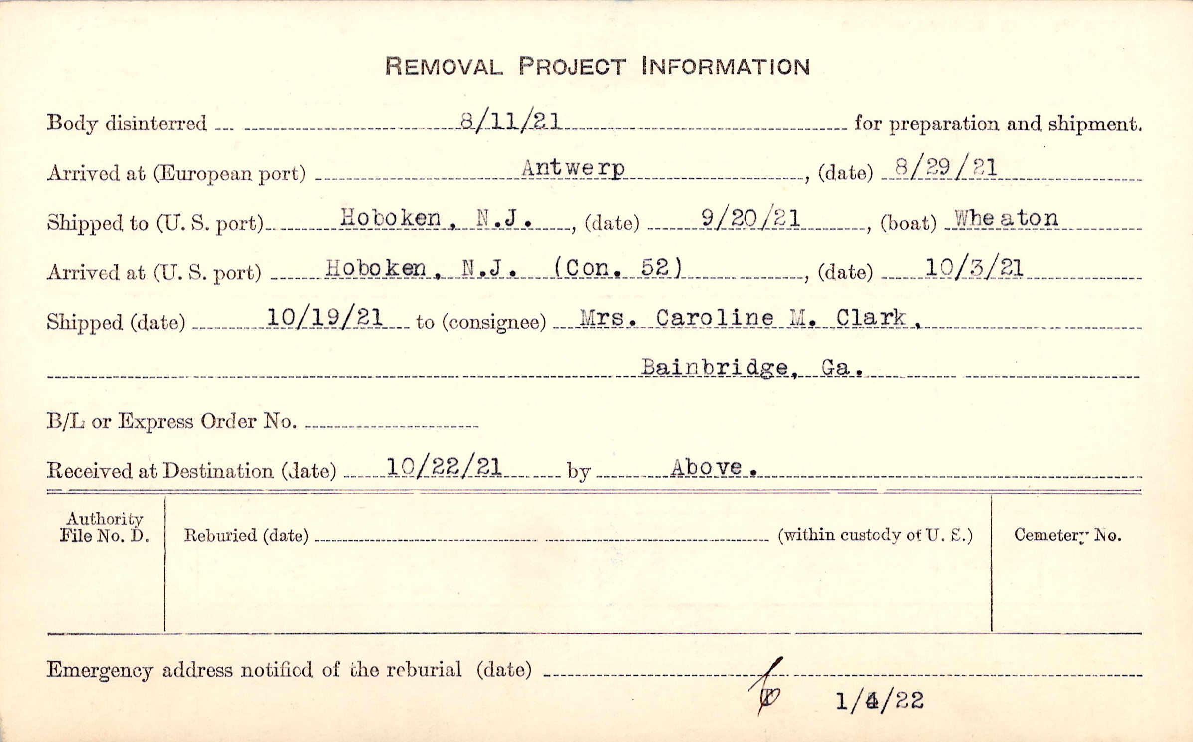 Body disinterred 8/11/1921 for preparation and shipment.