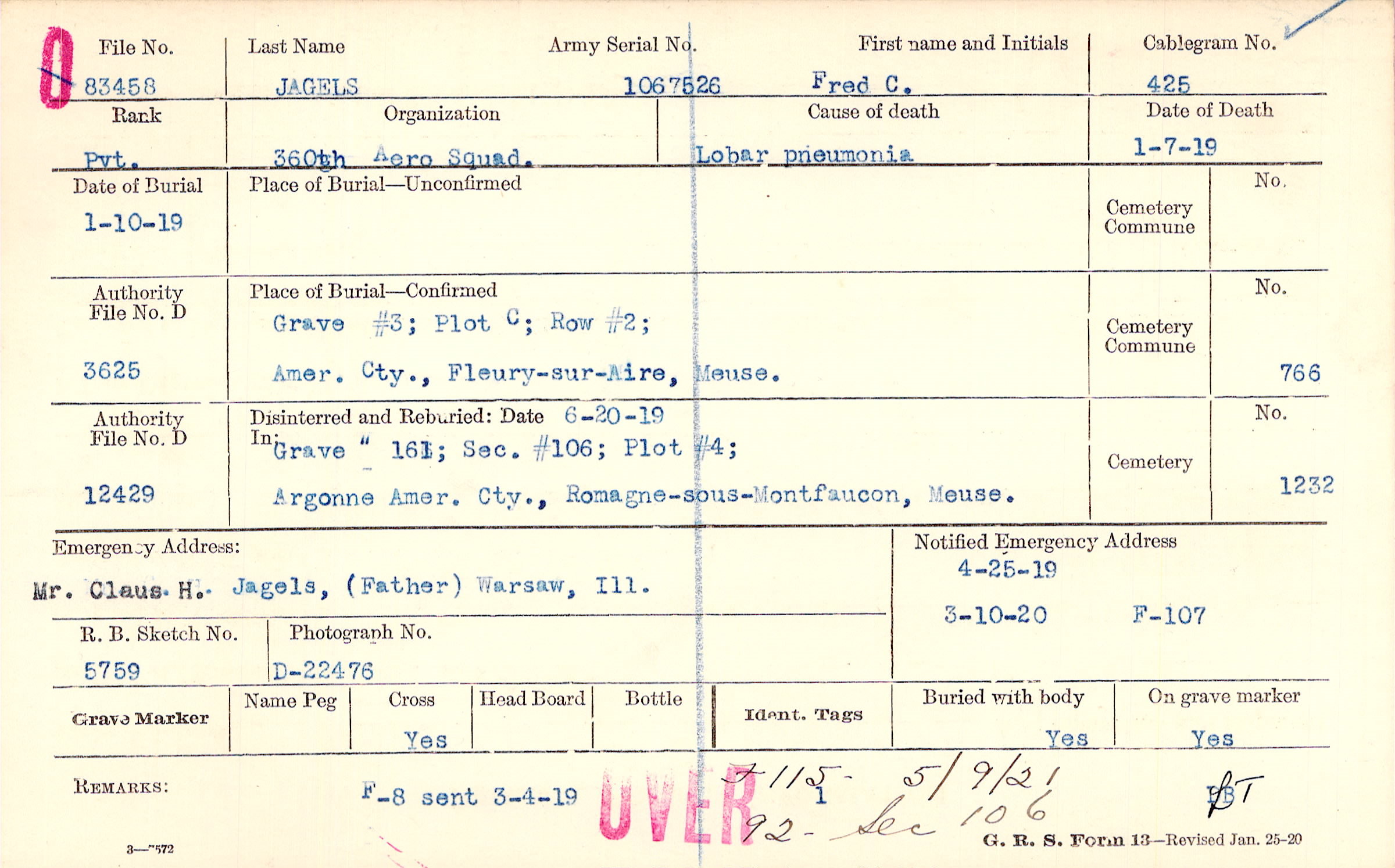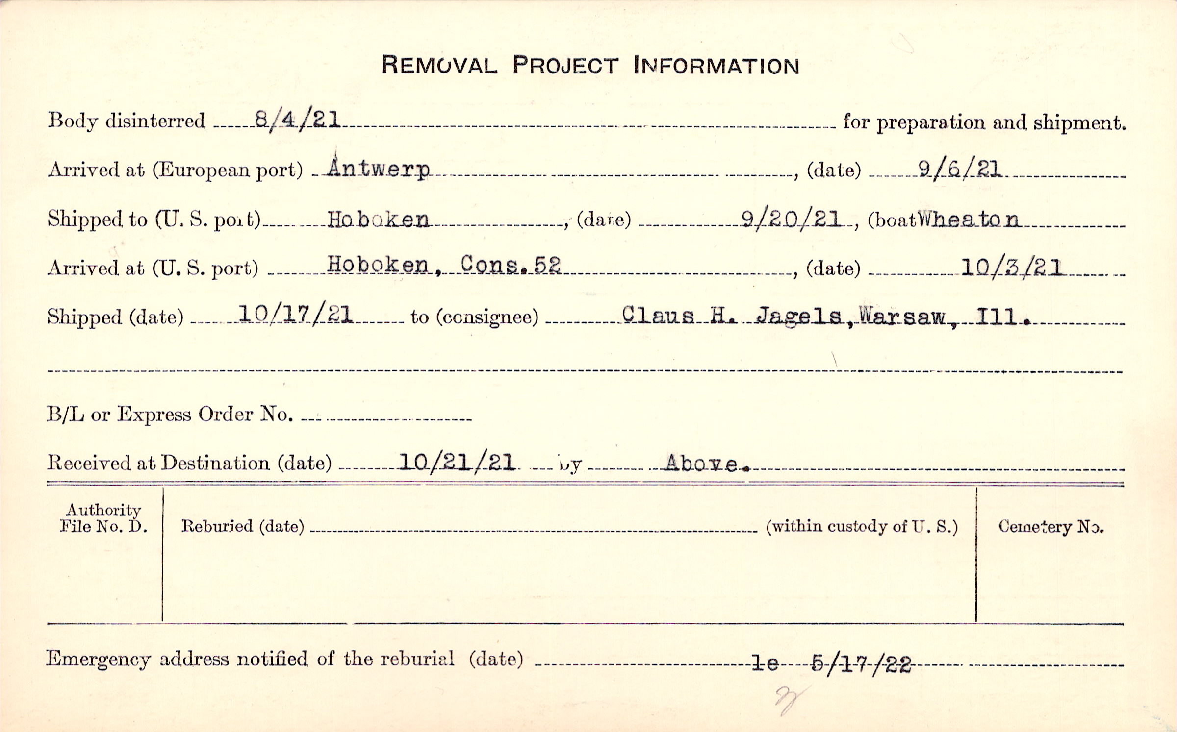 Body disinterred 8/4/1921 for preparation and shipment.