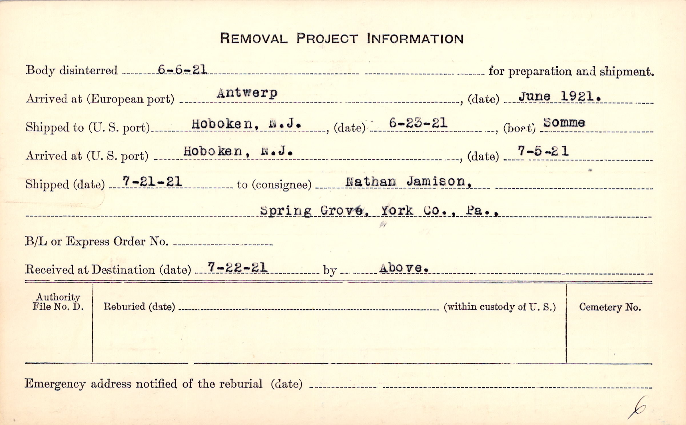 Body disinterred 6/6/1921 for preparation and shipment.