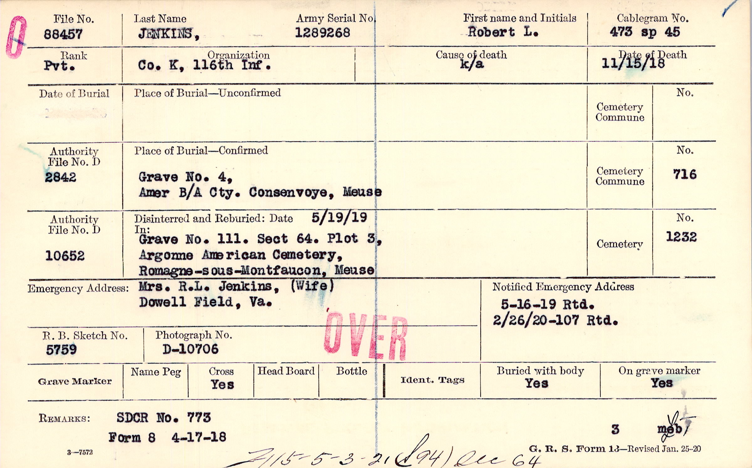 5/16/1919 Rtd, Form 107: 2/26/1920 Rtd