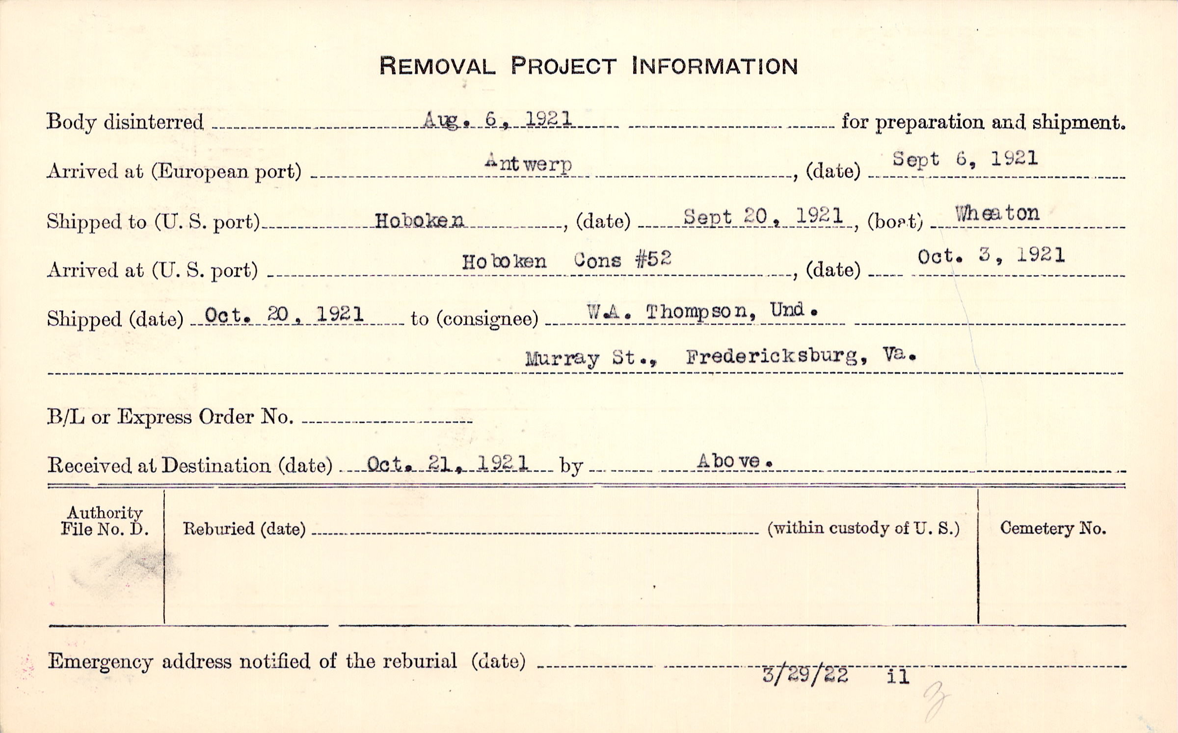 Body disinterred 8/6/1921 for preparation and shipment.