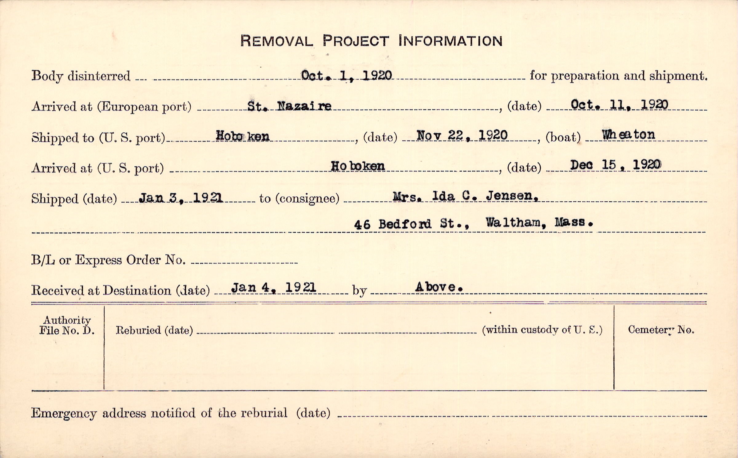 Body disinterred 10/1/1920 for preparation and shipment.